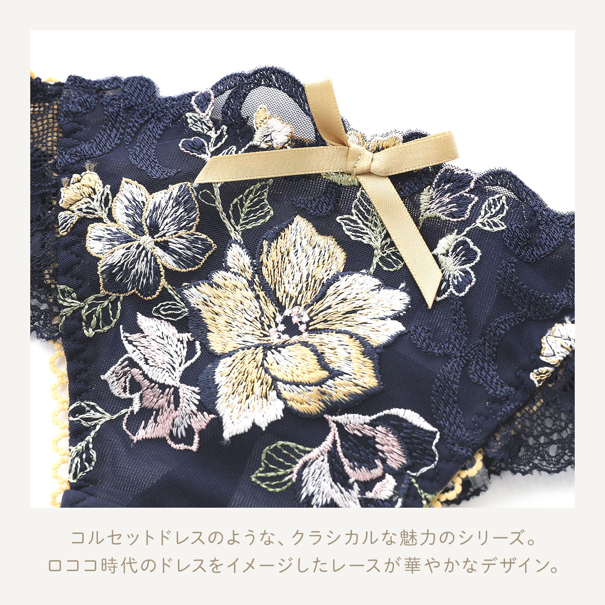 コルセットドレスのようなクラシカルなデザインが魅力のシリーズ、リサマリレーヌ「エリオット」コレクション。ロココ時代のドレスをイメージしたレースは、お花と幾何学模様をあしらい、それぞれステッチを変化させることで華やかさと奥行きを演出。全体的に丸みのあるシルエットで、まるでコルセットドレスをまとったかのような、豪華で気品あふれる美しさに仕上げました。