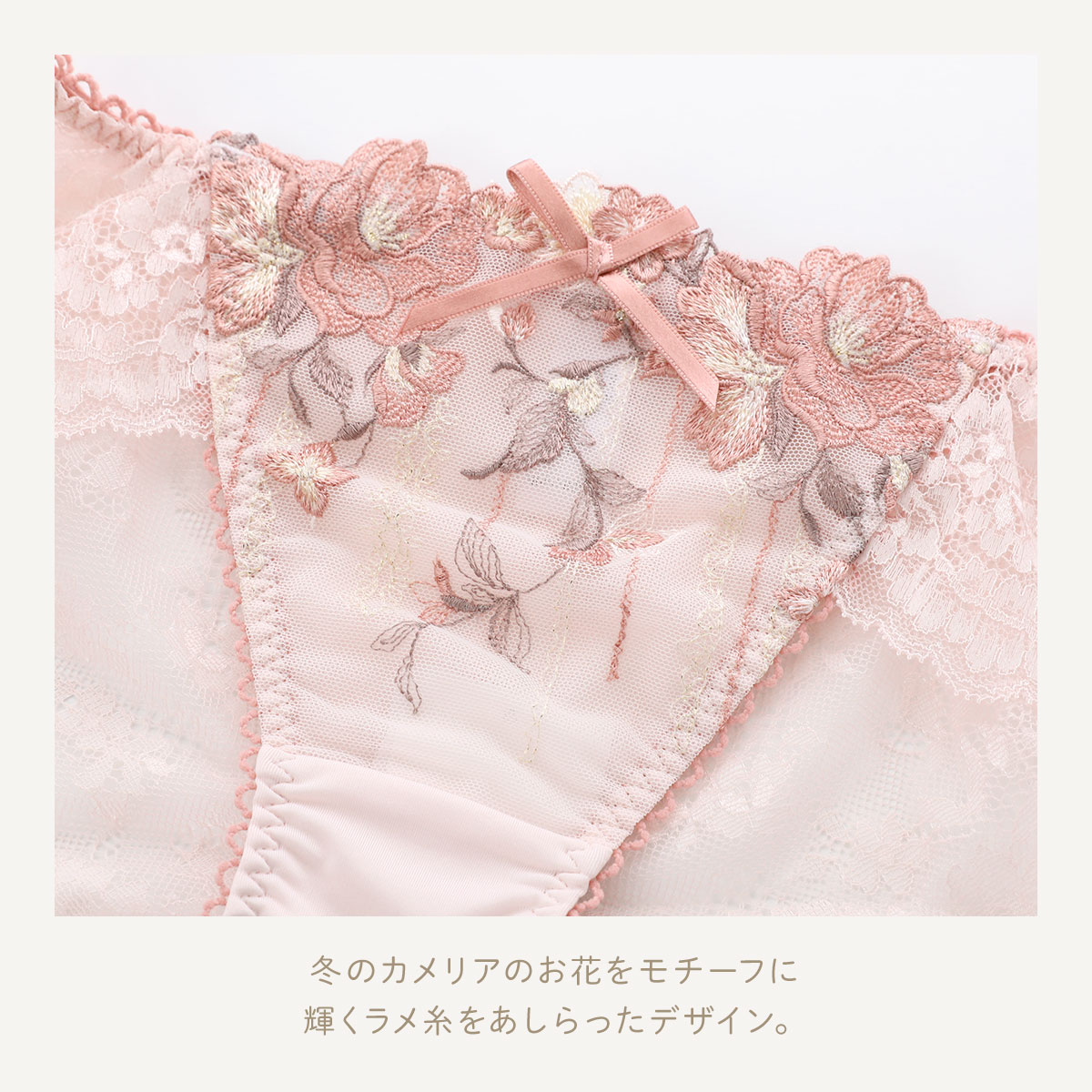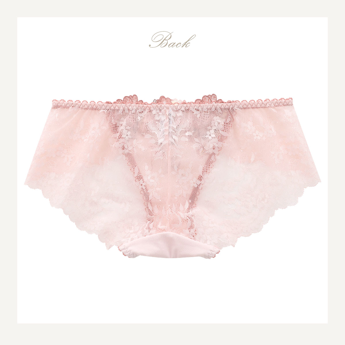 バック全体にレースをあしらったレースショーツ。繊細なレースを使用し、美しい透け感。通気性がよく、快適にご着用いただけます。ボトムスへもショーツラインがひびきにくいです。