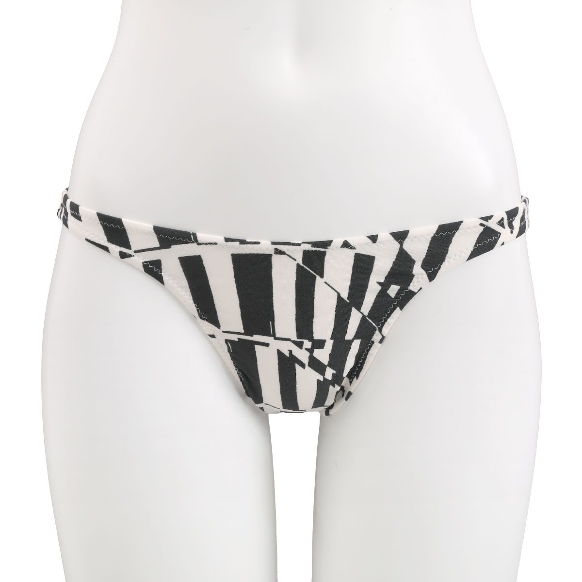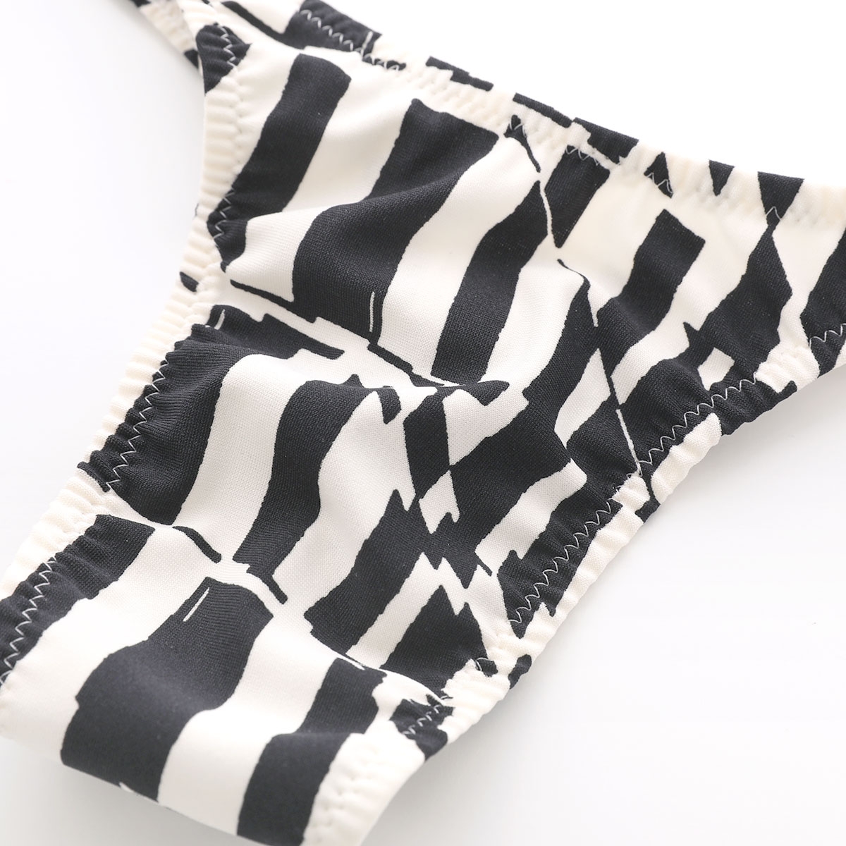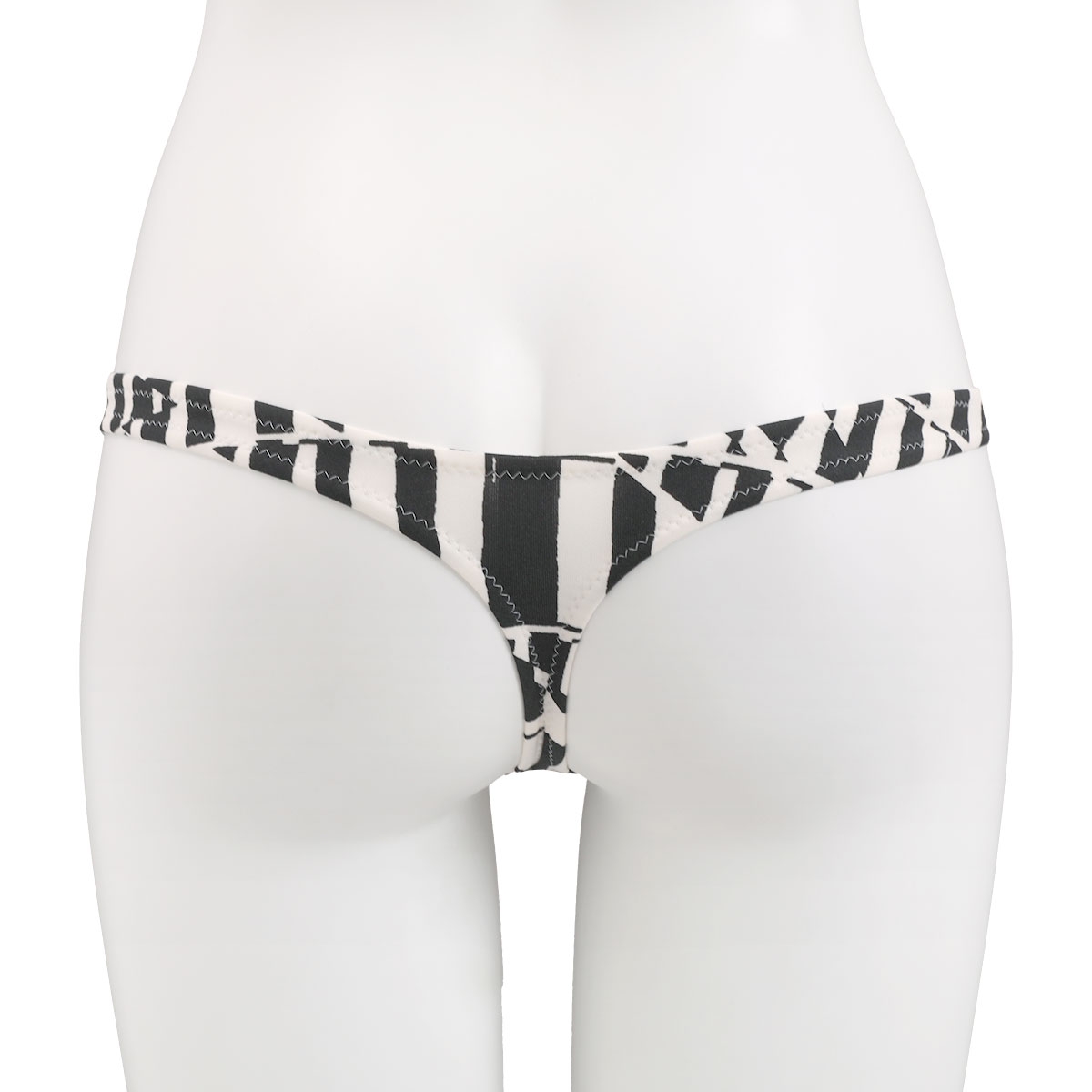 オフホワイトとブラックの意図的にずらしたストライプデザインのTバックショーツ。身生地は程よい厚みで伸びやか。すべすべなめらかなストレッチ素材を使用し、軽い肌あたりでフィット感が心地よい生地です。