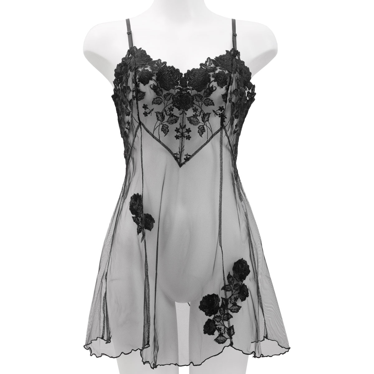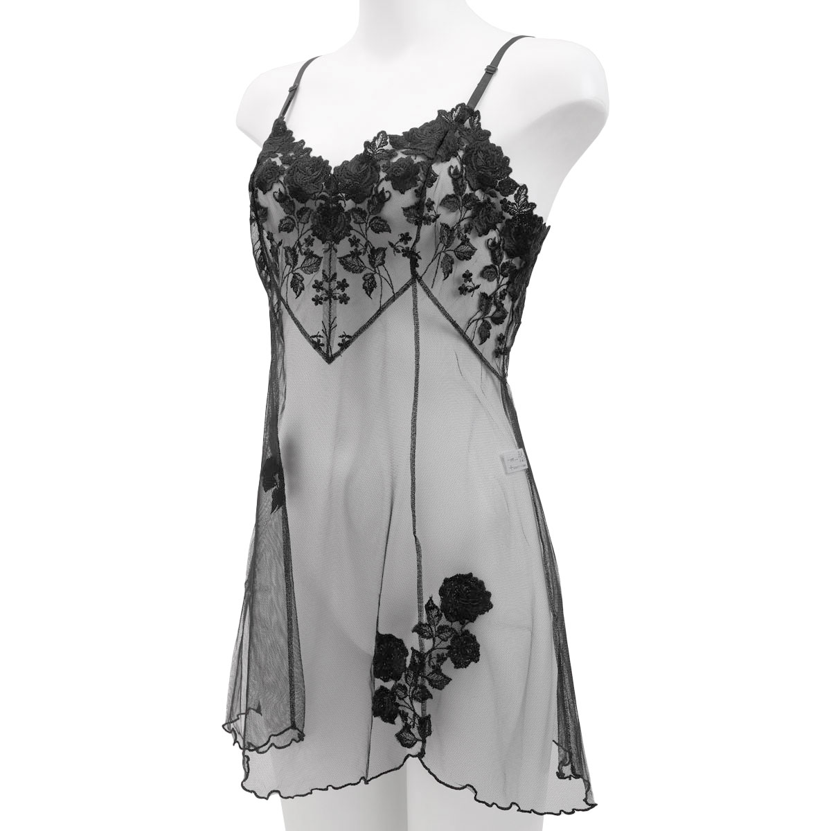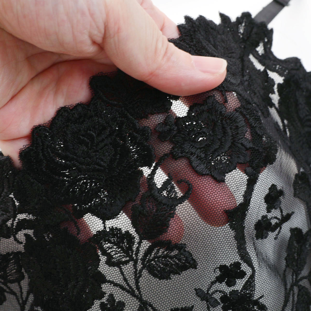 ボンレヴェール BonRevaire バラ柄チュールレース シースルー レース ミニスリップ 日本製(BK-ブラック-M-75)