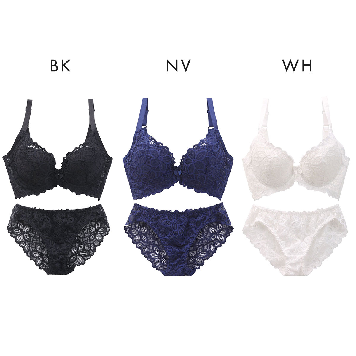 立体的な大花が特徴的なレースを使った、総レース3/4カップブラショーツセット。シンプルな単色ながらも、お花の存在感が際立つデザイン。