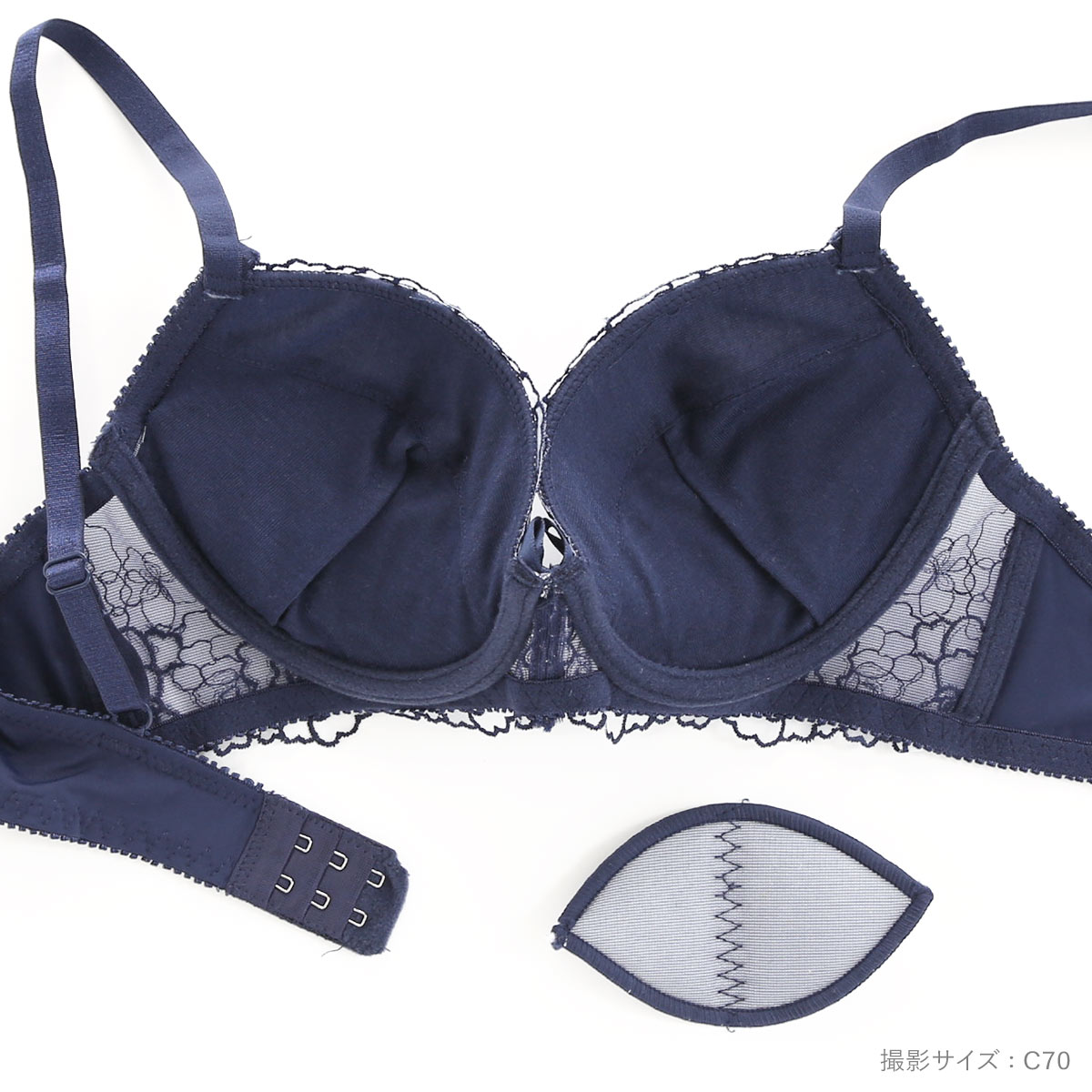 カップ裏は取り外しできる薄手のレモンパッドと下厚内蔵パッドでボストボリュームをUP。背中のアンダーは伸びが良い肌触りなめらかな身生地を使用し、楽な着け心地です。