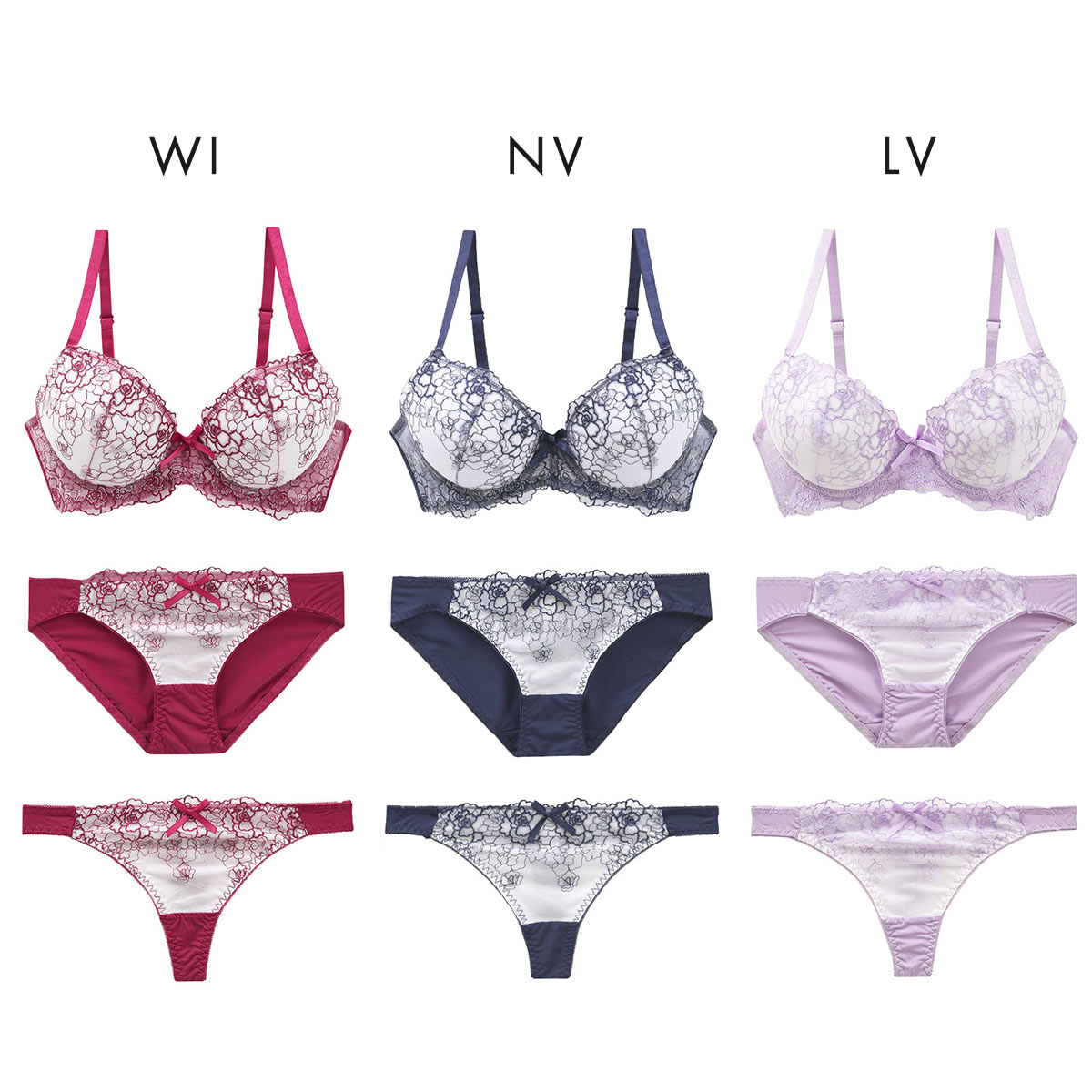 スタンダードショーツとTバックショーツ付きのお得なブラショーツ3点セット。ラメ糸で艶感をプラスしたローズが映える、セクシー可愛いデザインです。