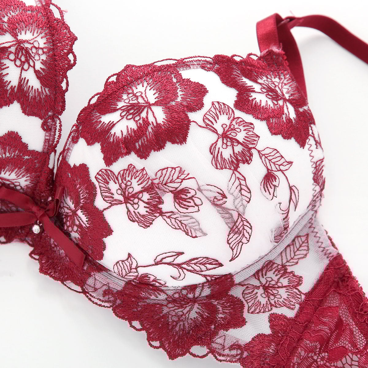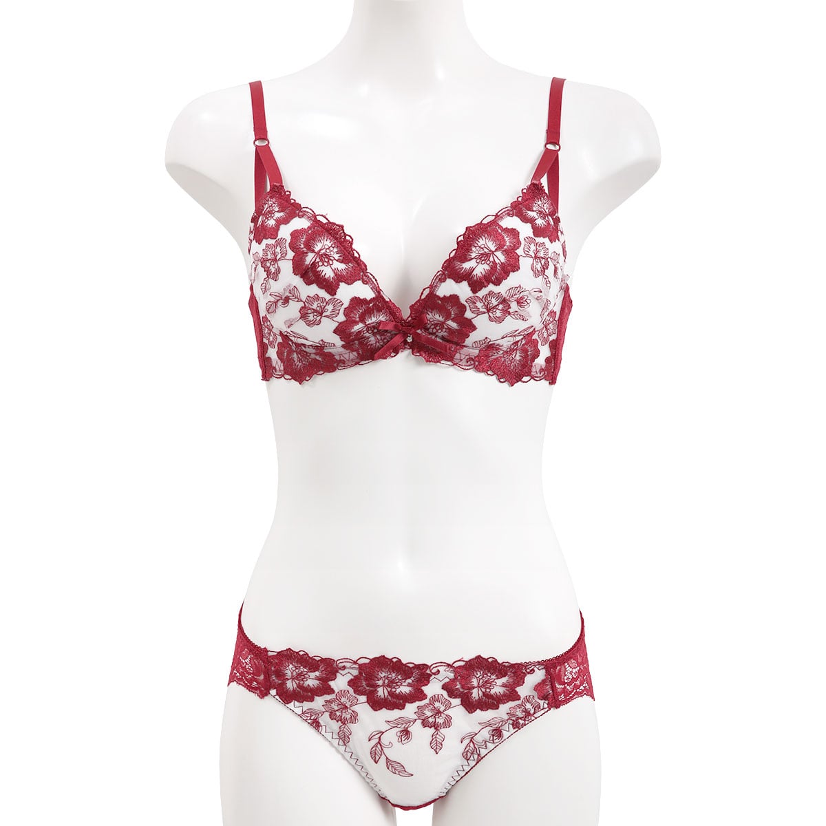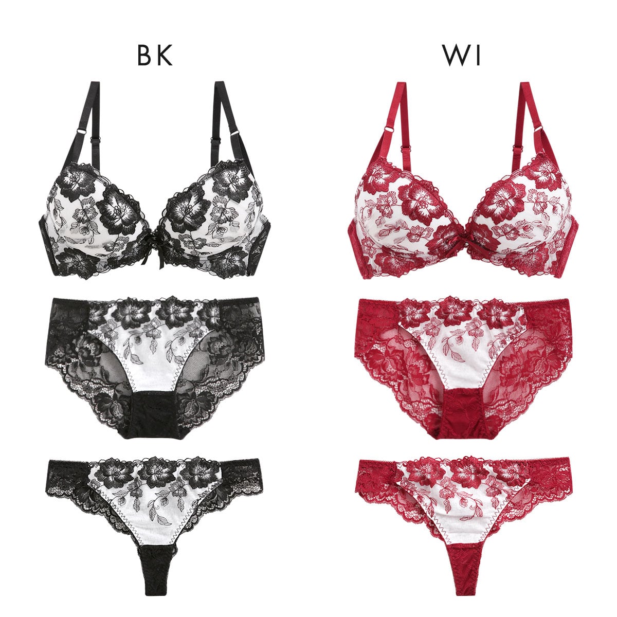 スタンダードショーツとTバックショーツ付きのお得なブラショーツ3点セット。繊細な刺繍レースとストレッチレースの優美なデザイン。