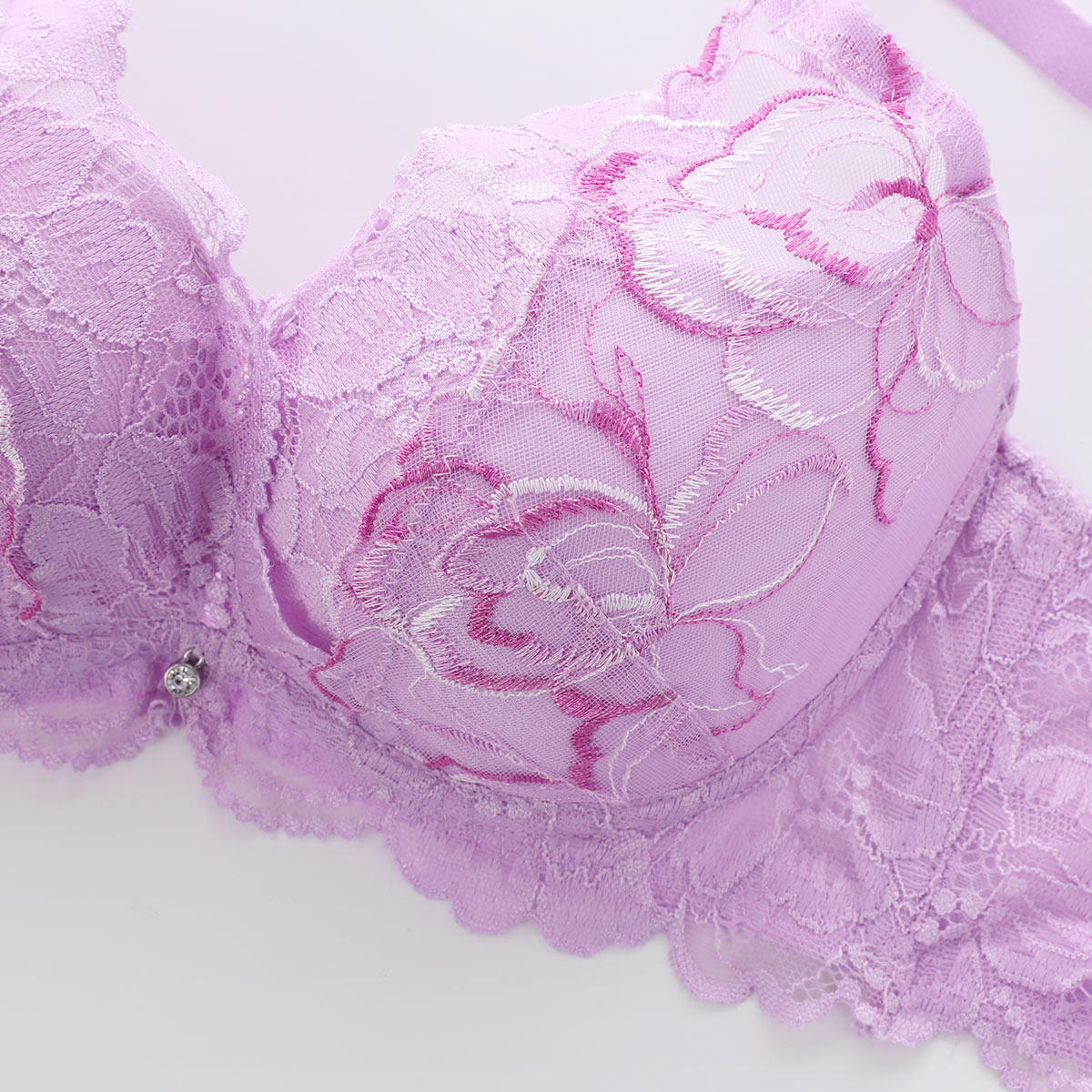 モールドカップはバストの上辺に沿うようにこだわり、取り外しできるパッド付きで、お好みでボリューム調整ができます。前中心低めで、カシュクール型になっているのでワイヤーの当たりが痛くならない仕様になっています。