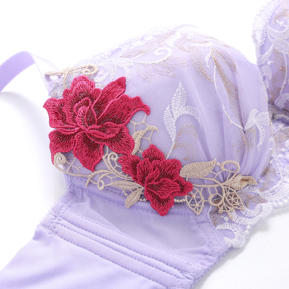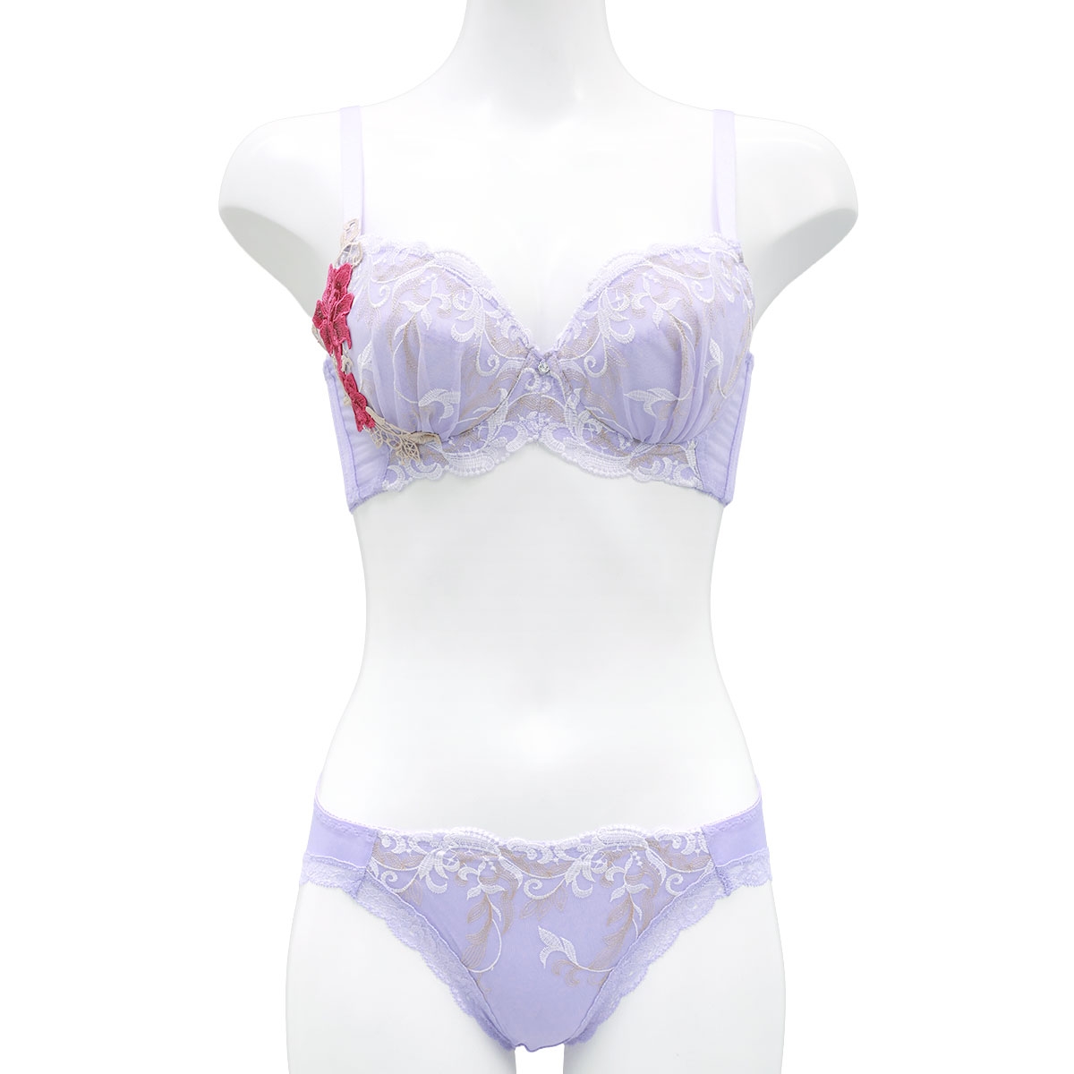 気品漂う豪華なバラ柄モチーフがポイントのブラショーツセット。ブラジャーの前中心にはストーンをあしらい、アクセントを添えています。