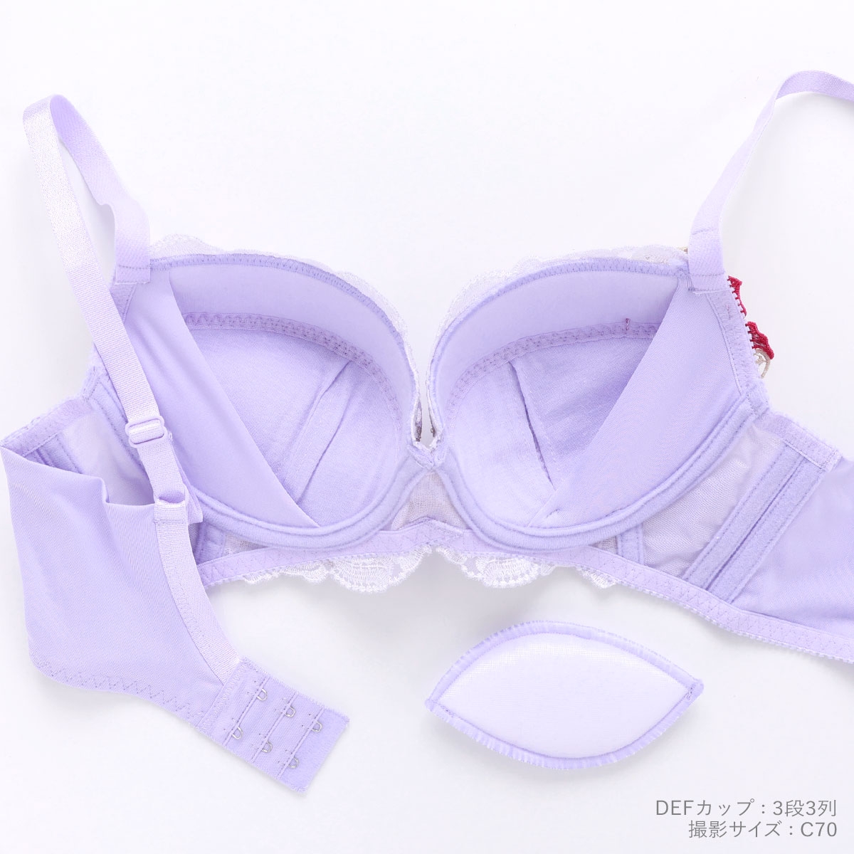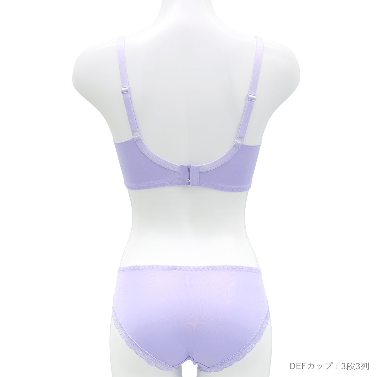 | 仕 様 | ブラ ・ホックの数:2段3列(DEFカップは3段3列) ・3/4カップ ・パッド取外し:可能 ・肩紐取外し:不可 ・ミディアムワイヤー入り ・サイドボーン:左右3本ずつあり(計6本)