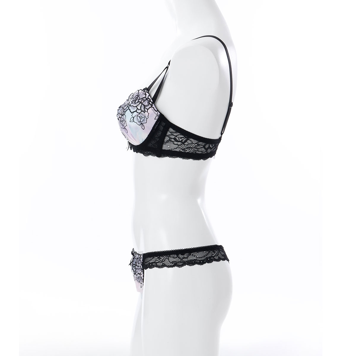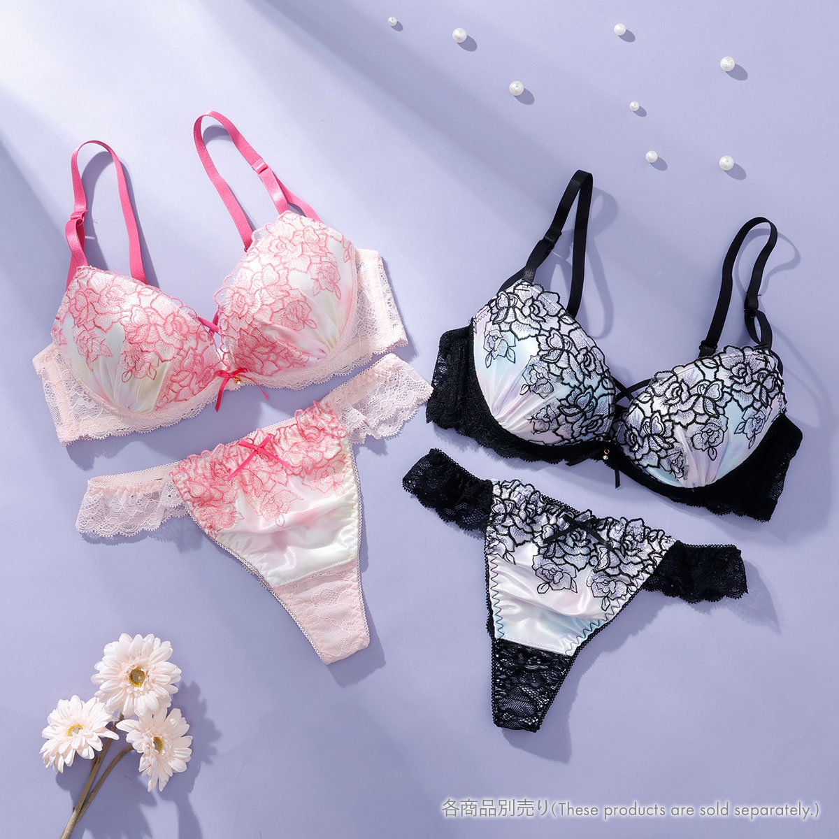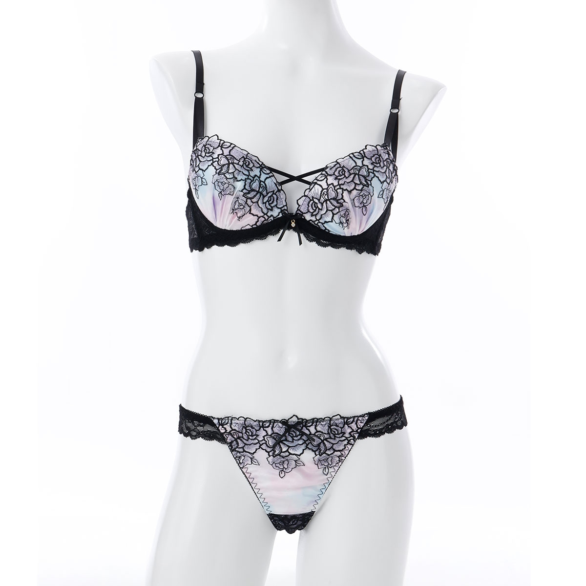 オーロラのようなグラデーションプリントに線画調の花柄刺繍をあわせた、華やかセクシーなブラジャー&Tバックショーツセットです。胸もとでクロスする編み上げ風のコードデザインがセンシュアルなアクセントになっています。