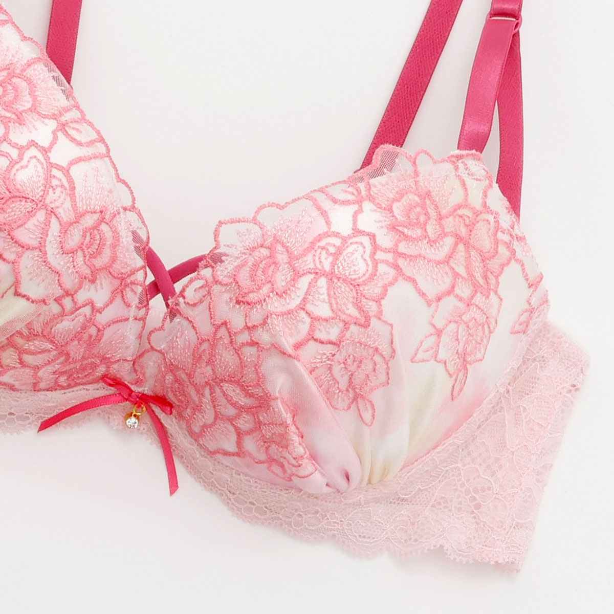 ブラジャーにはモールドカップを採用し、自然なまるみのあるバストをメイク。カップ裏は下厚内蔵パッドと取り外し可能なふわふわレモンパッドのWパッド仕様で、ふっくらボリュームのあるバストをメイクします。