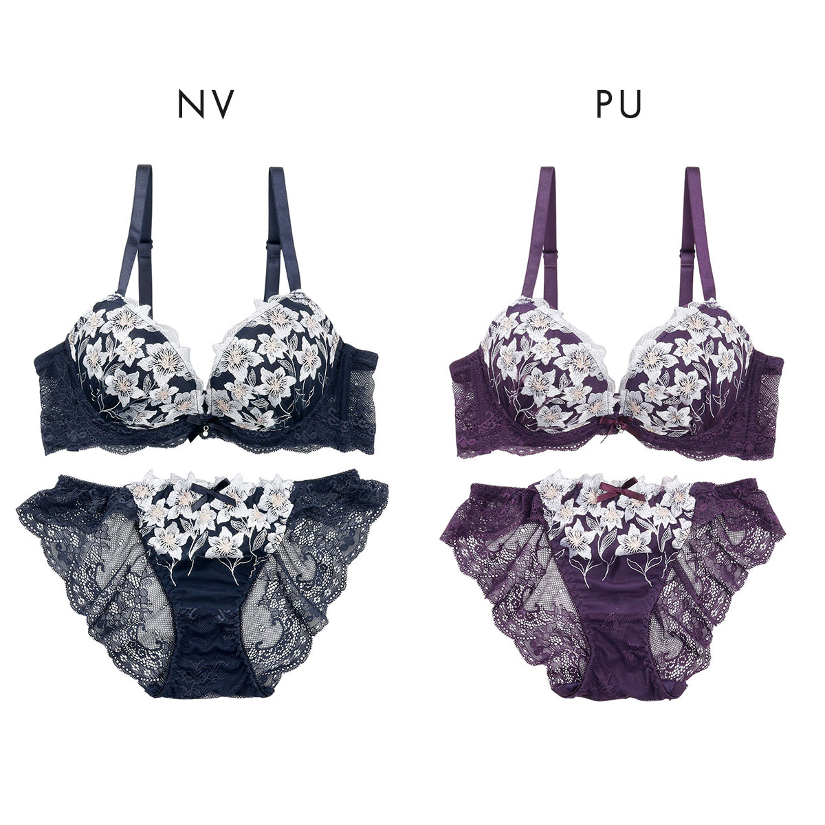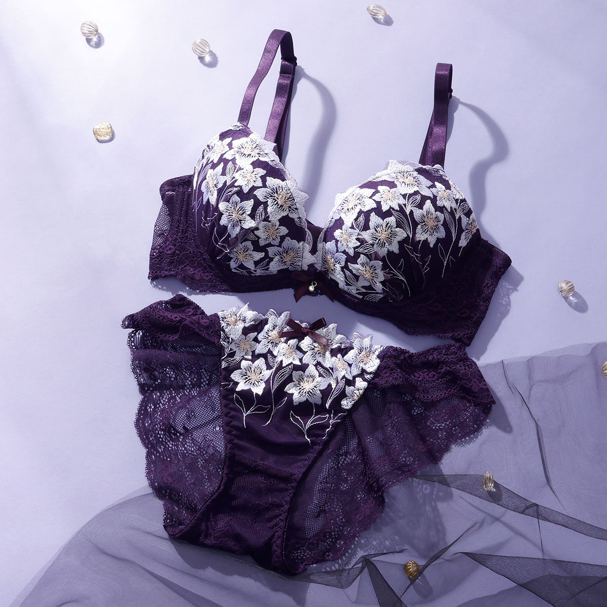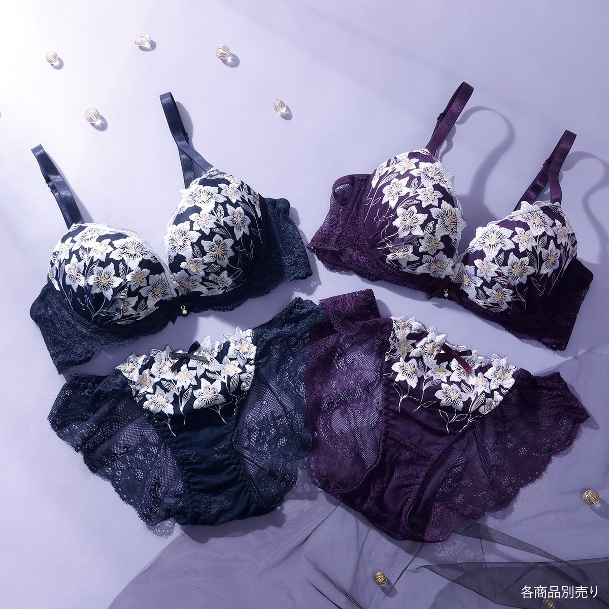 可憐な花柄刺繍が艶やかに咲き誇る、大人上品なブラジャー&ノーマルショーツセットです。