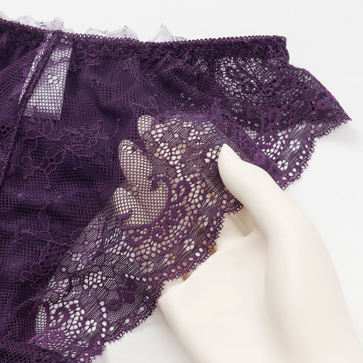 ショーツはデイリーに使いやすいノーマルタイプ。サイドからバックはやわらかなストレッチレース仕様で、透け感がちょっぴりセクシーな気分。アウターにひびきにくいので、タイトなボトムの日にもおすすめです。