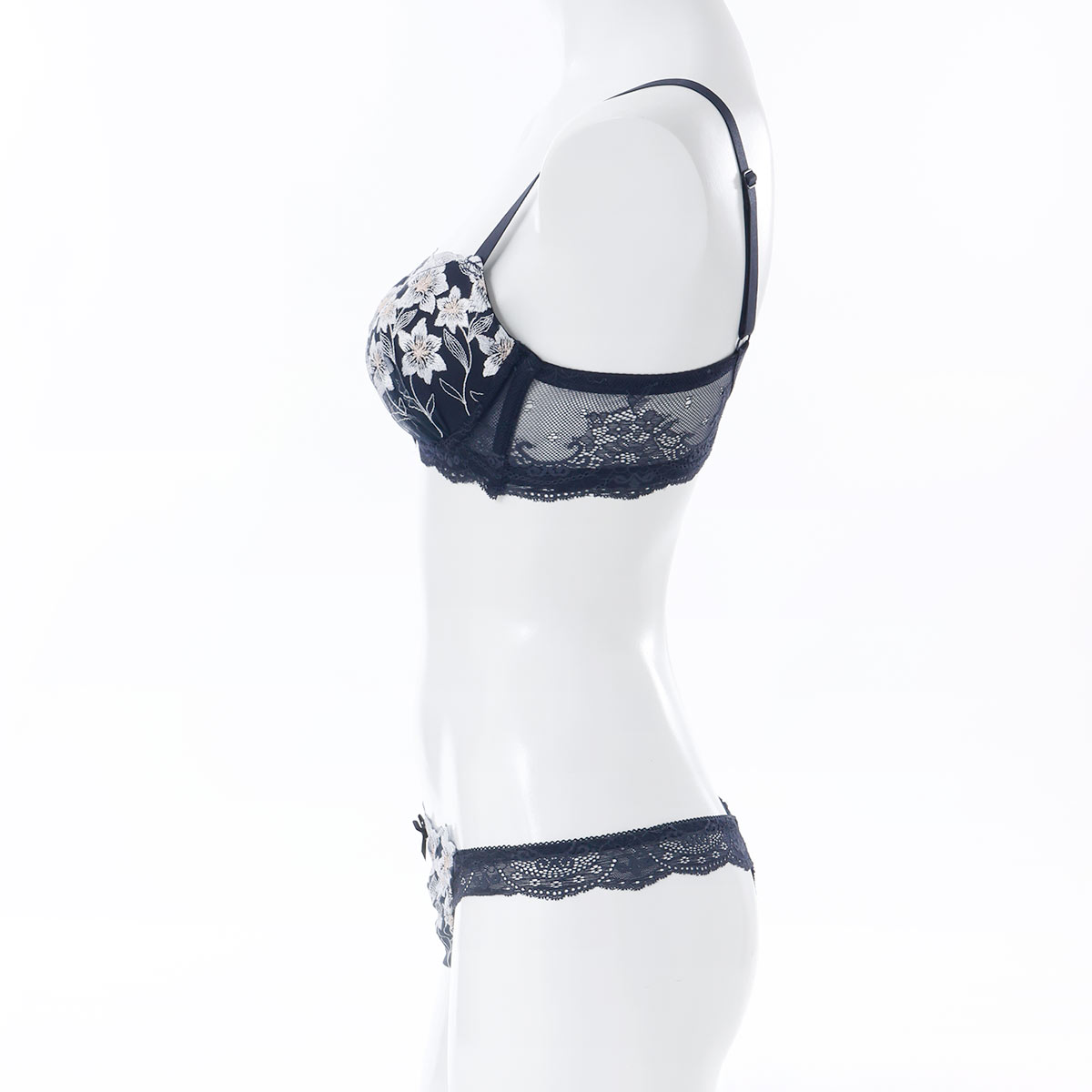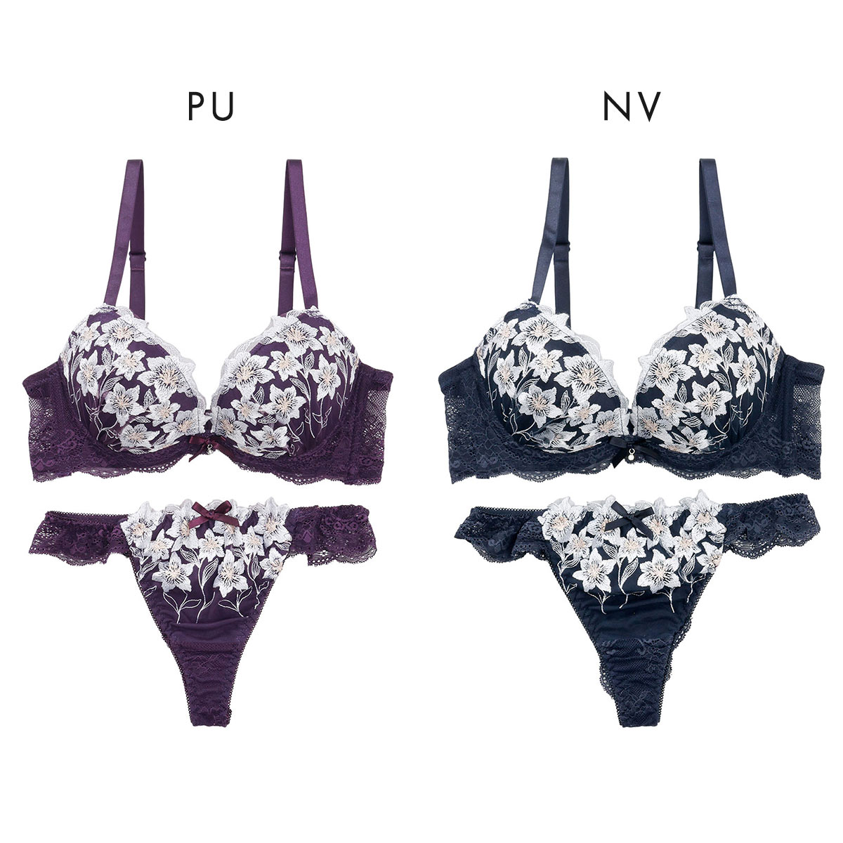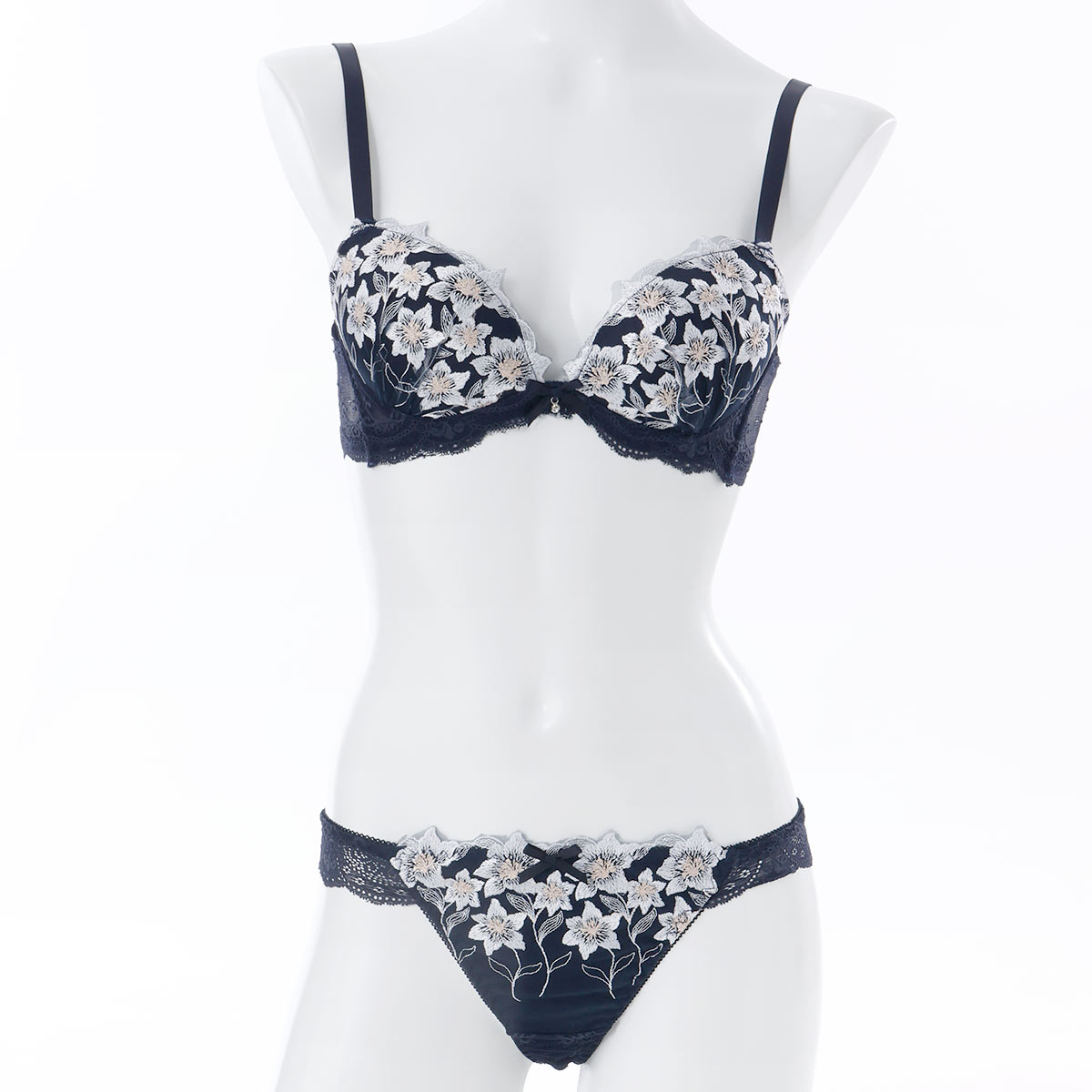 可憐な花柄刺繍が艶やかに咲き誇る、大人上品なブラジャー&Tバックショーツセットです。