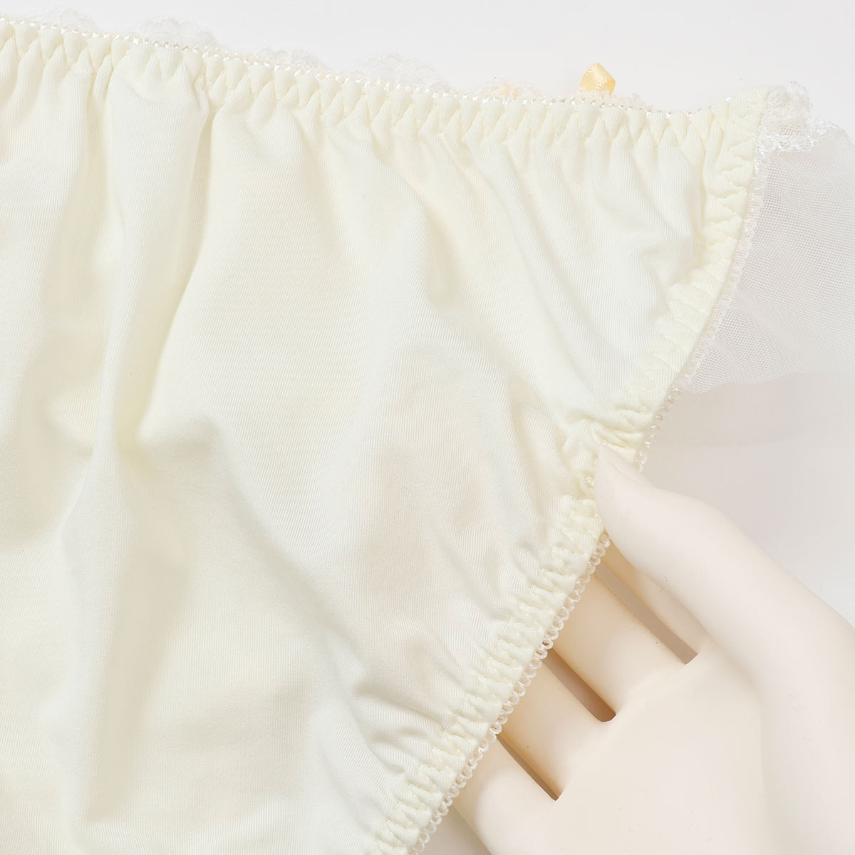 セットショーツはデイリー使いにおすすめのスタンダードタイプ。サイドもフリルチュールをあしらい、甘々に仕上げています♪バック身生地はタテヨコに伸縮性があり、なめらかな肌ざわりで心地よいフィット感です。