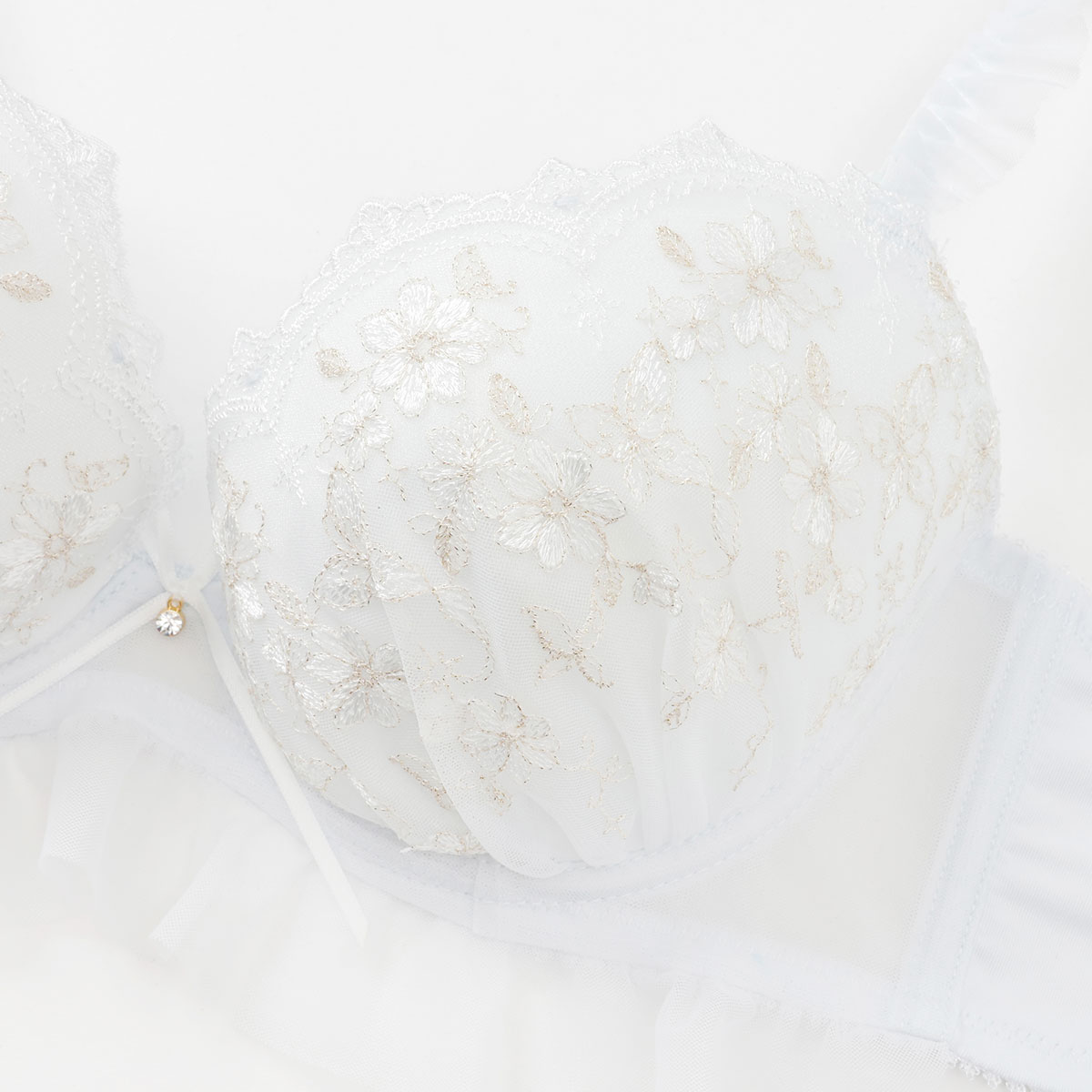 まるでお花畑に妖精が舞い降りたような、やわらかな光を纏うロマンティックなデザイン。繊細な刺繍にあしらったラメ糸がさりげなく上品な輝きを放ちます。ストラップやアンダー、ショーツのサイドにあしらったふんわりとしたフリルチュールもピュアでカワイイポイントです。前中心には長めのサテンリボンとチャームをあしらい、華やかなアクセントを添えました。