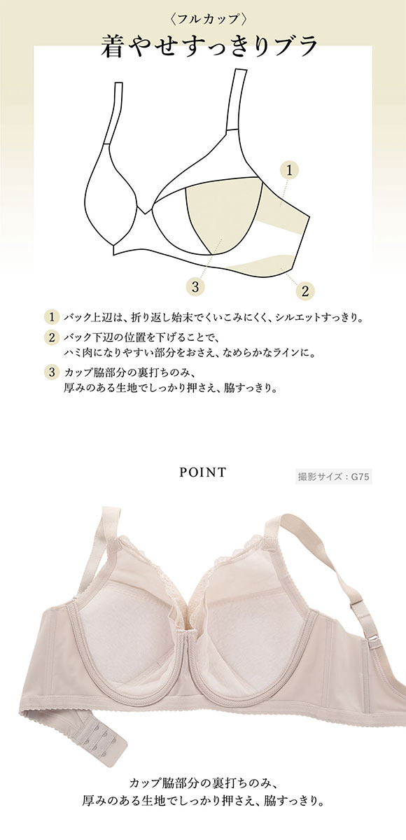バストをすっぽり包んで、すっきり見せてくれるフルカップブラジャー。カップ脇部分の裏打ちのみ、厚みのある生地でしっかり押さえ、脇すっきり。