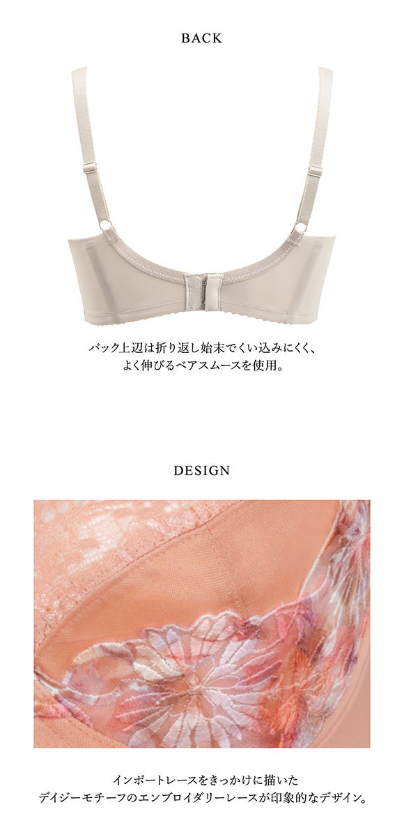バック下辺の位置を下げることで、ブラをつけたときに気になる脇から背中の段差をおさえ、なめらかなラインに。前・後・横、どこから見てもスマートでなめらかなシルエットをメイクします。
