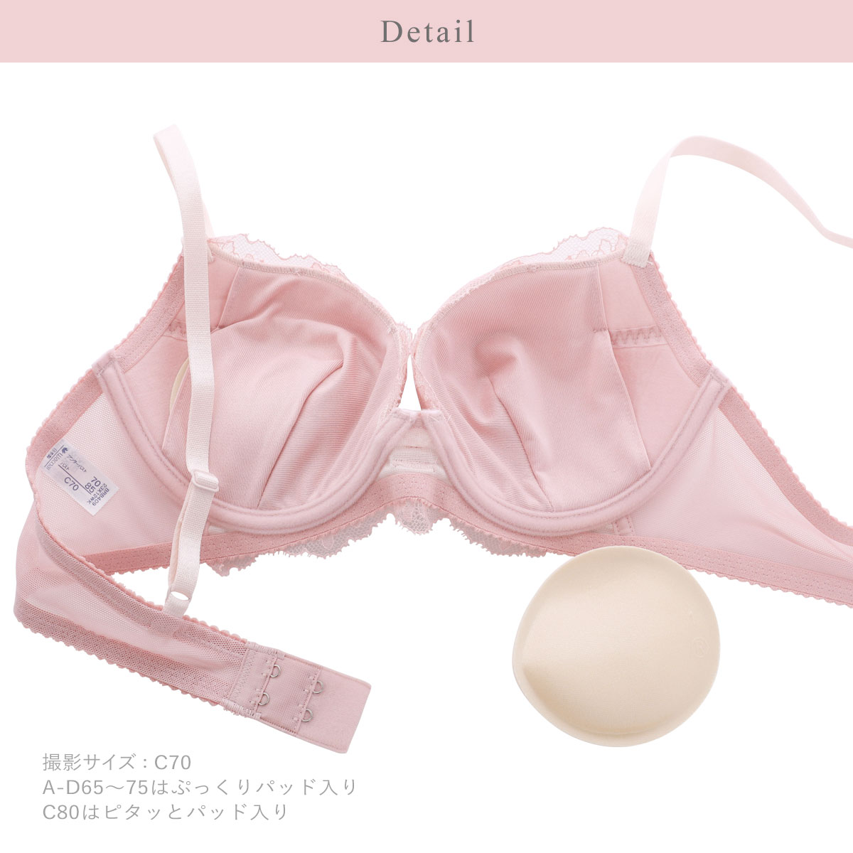 | 仕 様 | ・ホックの数:2段2列 ・3/4カップ ・A-D65~75はぷっくりパッド入り(C80はピタッとパッド) ・パッド取外し:可能 ・肩紐取外し:不可 ・ワイヤー入り ・サイドボーン:なし
