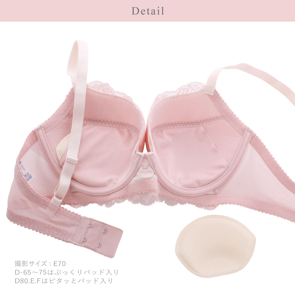 | 仕 様 | ・ホックの数:2段2列 ・3/4カップ ・D65-75はぷっくりパッド入り、D80、E.Fはピタッとパッド入り ・パッド取外し:可能 ・肩紐取外し:不可 ・ワイヤー入り ・サイドボーン:なし
