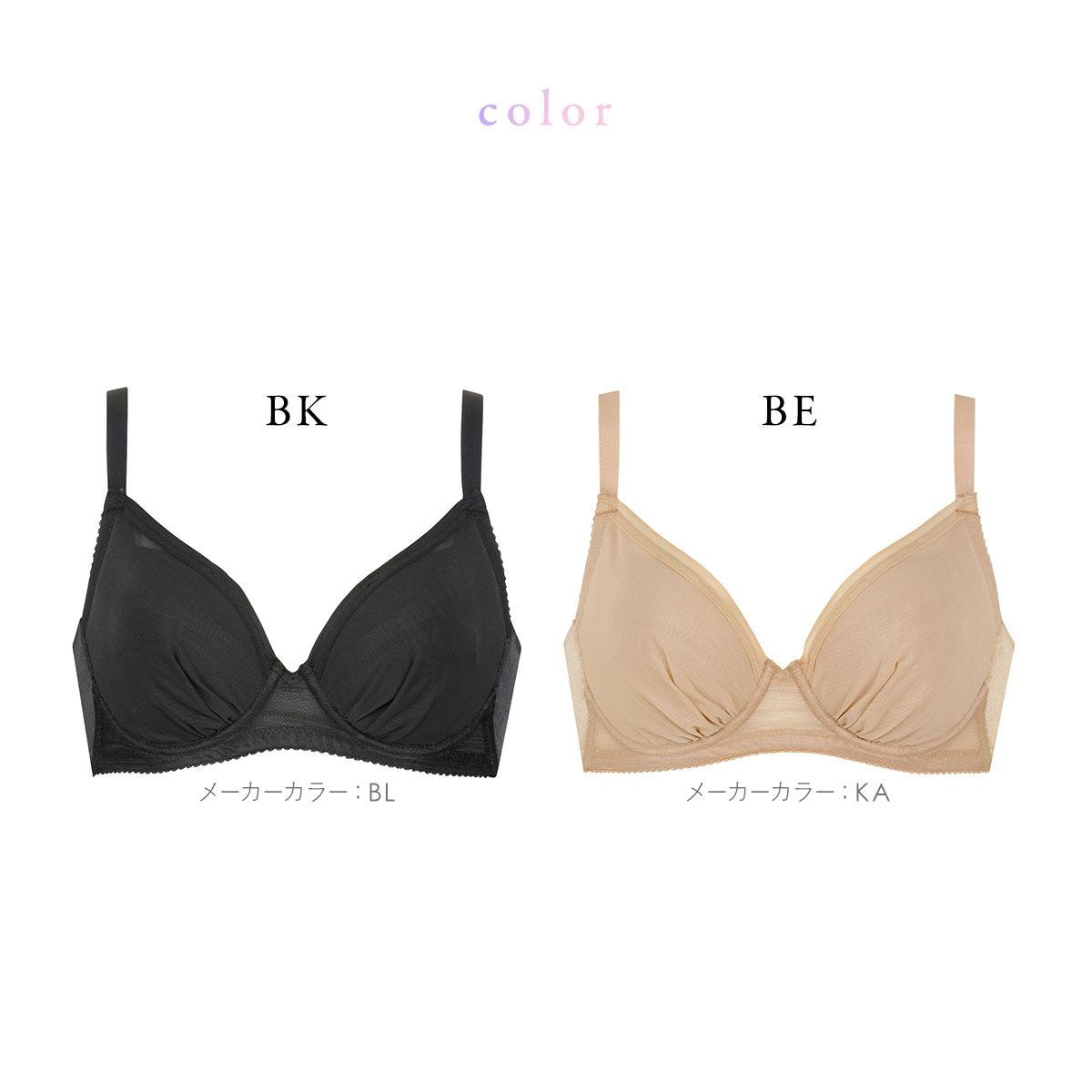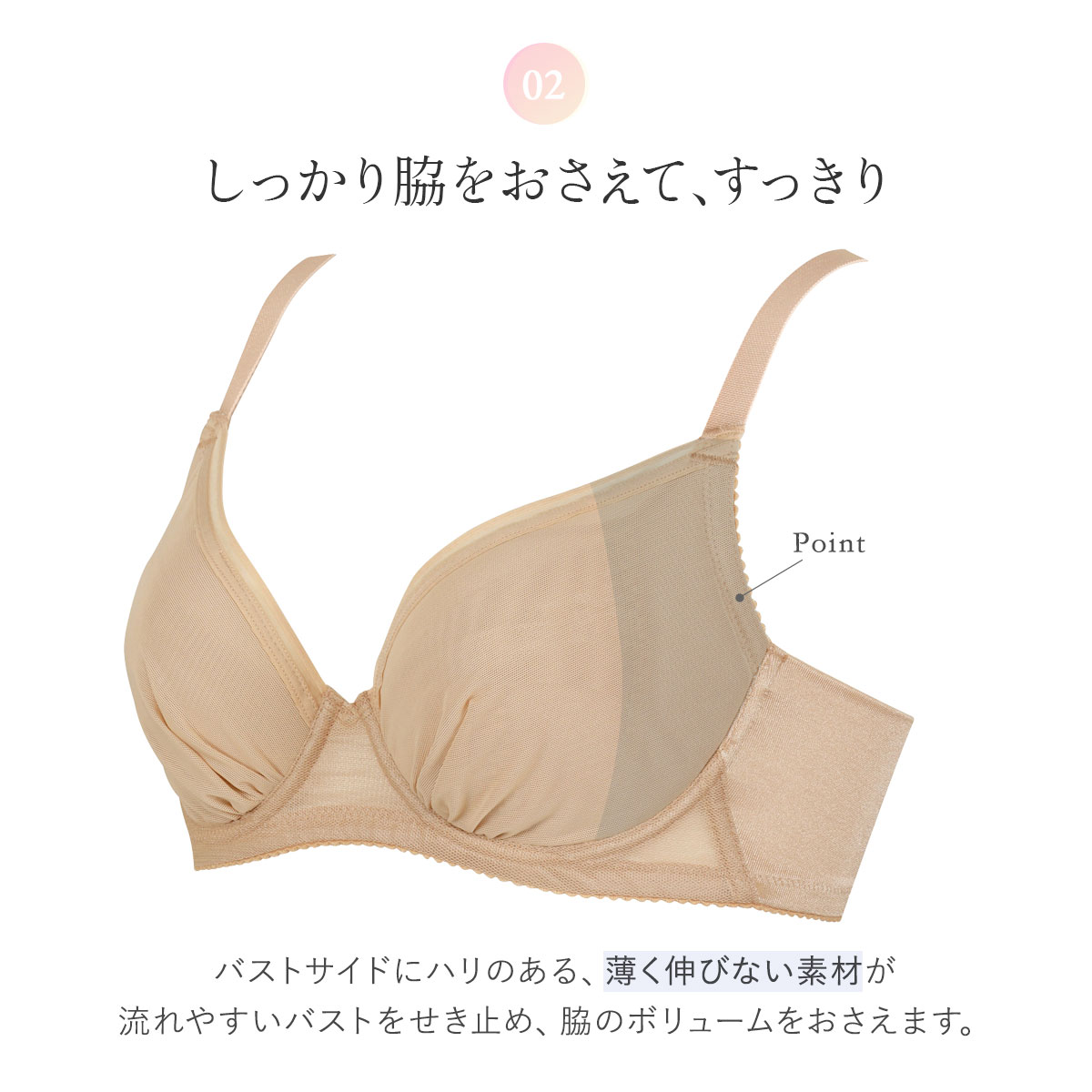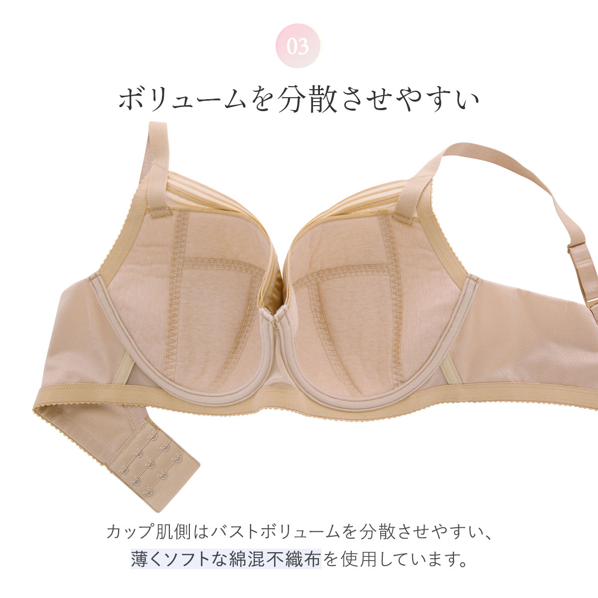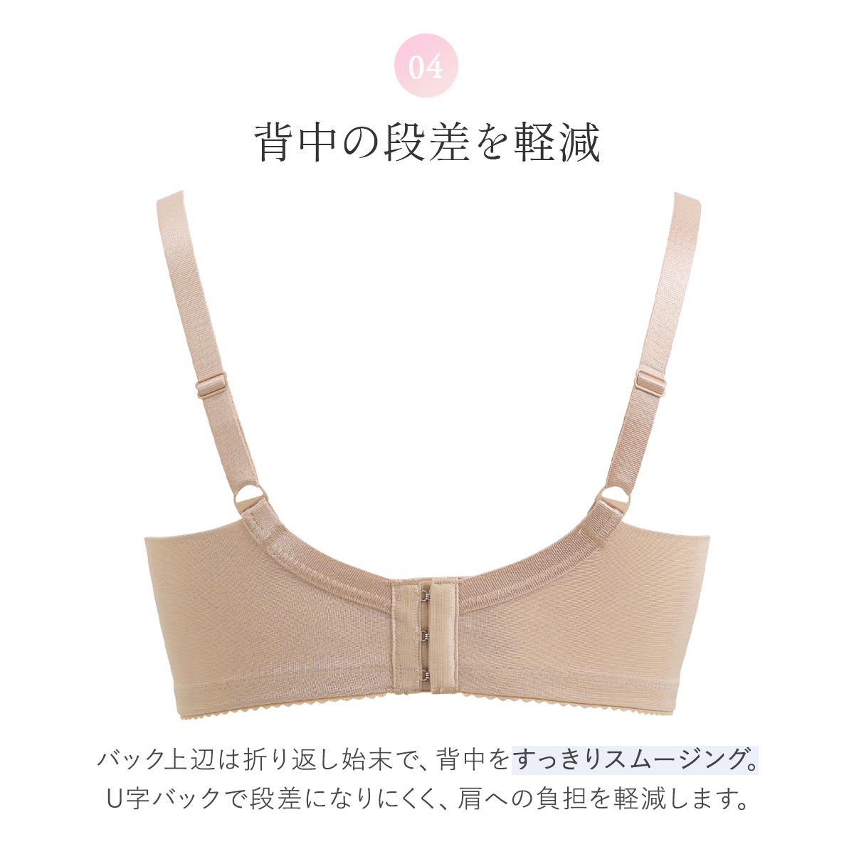 カップ肌側はバストボリュームを分散させやすい、薄くソフトな綿混素材を使用しています。バック上辺は二つ折りになっているので、脇から背中までをスッキリとスムージングします。
