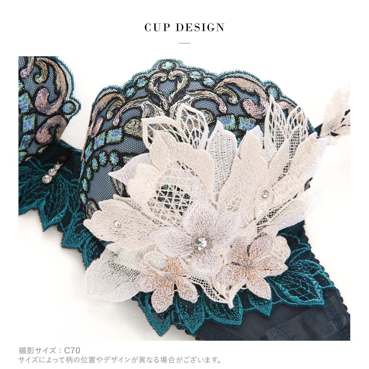 カップ肌側は滑らかな肌触りで、バストを優しく包み込むような着装感。バックにもアップリケをあしらい、バックスタイルもゴージャスに。