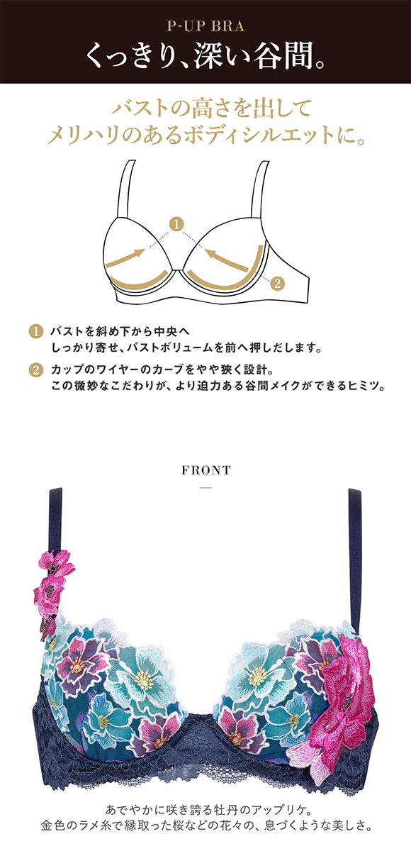ワイヤーのカーブをやや狭く設計した絶妙なこだわりが、迫力のある谷間メイクの秘密。バストボリュームを中央へしっかり寄せて前へ押し出し、谷間の美しい魅力的な胸もとを演出します。