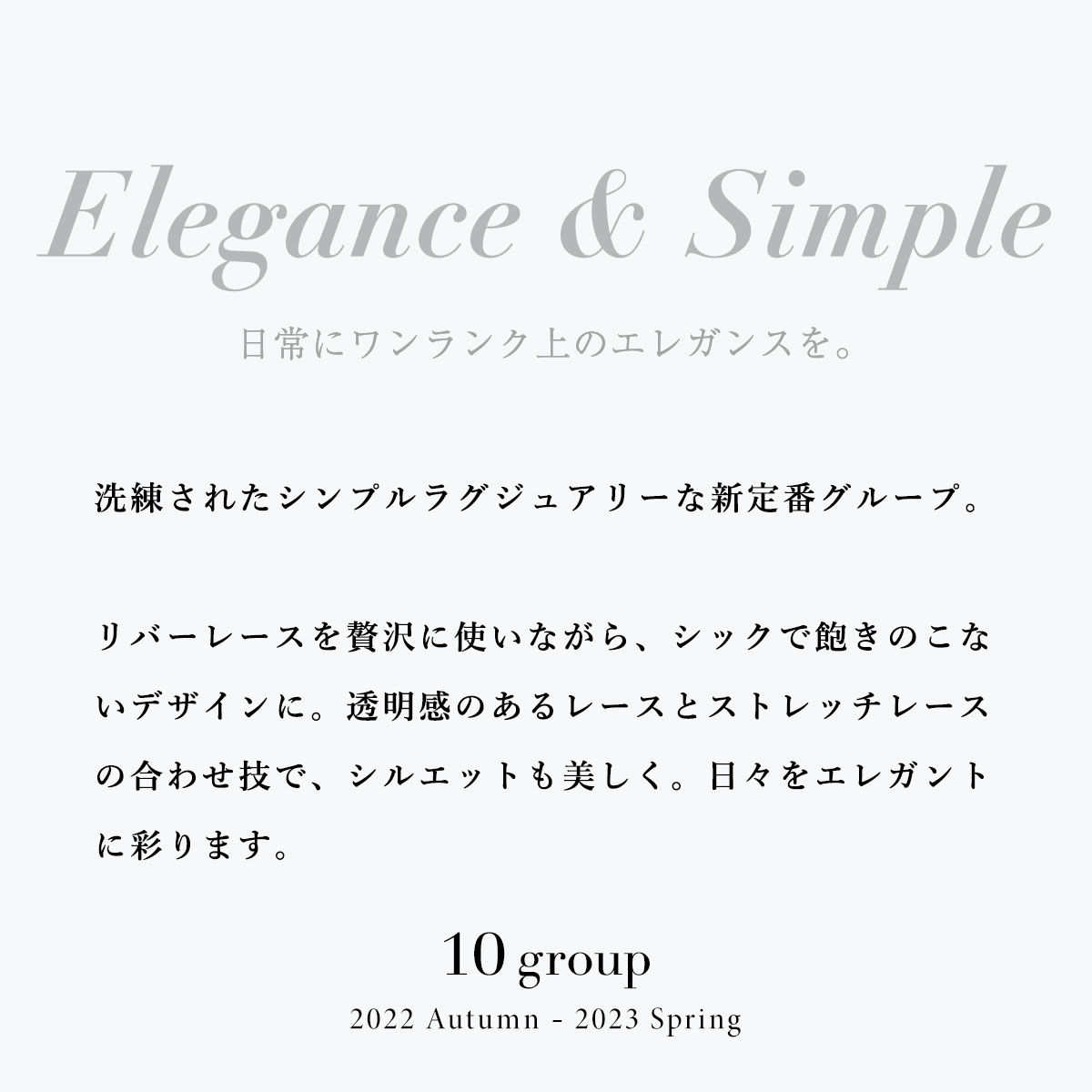 リバーレースを贅沢に使いながら、シックで飽きのこないデザインに。透明感のあるレースとストレッチレースの合わせ技で、シルエットも美しく。日々をエレガントに彩ります。