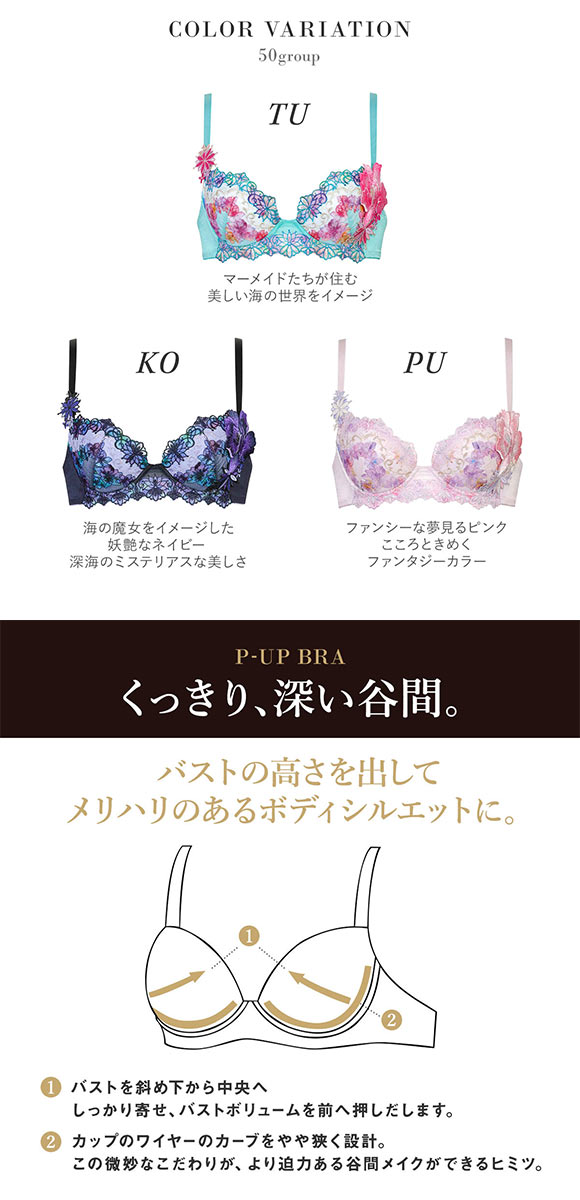 ワイヤーのカーブをやや狭く設計した絶妙なこだわりが、迫力のある谷間メイクの秘密。バストボリュームを中央へしっかり寄せて前へ押し出し、谷間の美しい魅力的な胸もとを演出します。
