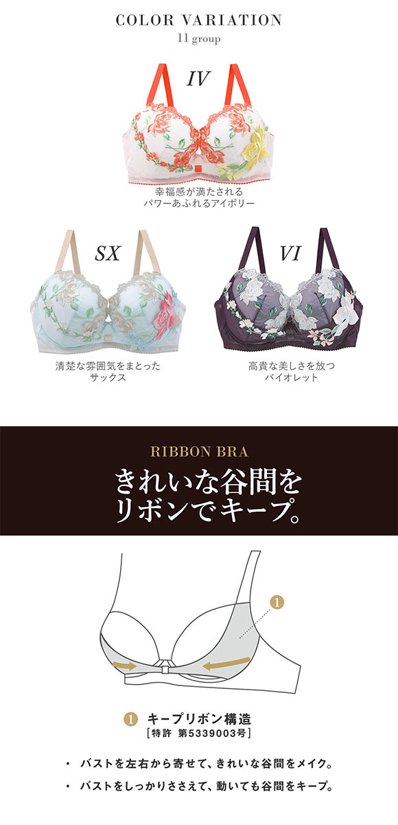 ブラパターンはキープリボン構造で谷間をつくる【リボンブラ】タイプ。フィット感が気持ちいいピタッとパッドがバストをボリュームアップさせ、キープリボンがバストを左右から寄せてキレイな谷間をメイク。