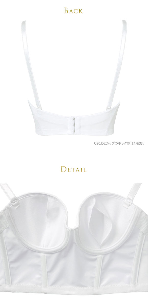 | 仕 様 | ・ホック:4段3列 ・ボーン:左右合計6本入り(カップ下、サイド、バック) ・1/2カップ ・パッドなし、パッドポケット付き ・肩紐取外し:可能 |