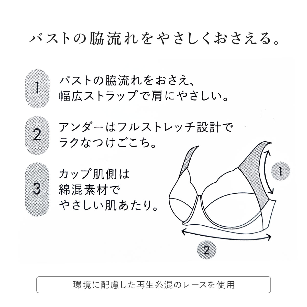 バストの脇流れをやさしくおさえる。