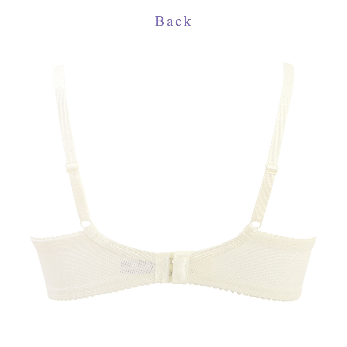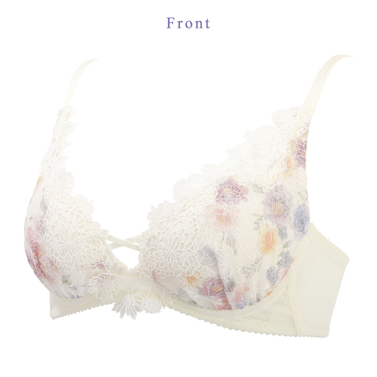モールドカップ肌側の厚みでバストを押し上げ、ボーンとカップ脇の切り替えで、ピタッとフィット。ハリとコシのあるプッシュアップ成型カップが自然なまるみのあるバストをメイク。前中心が低く、ノンワイヤーのため圧迫感の少ないラクなつけごこちです。