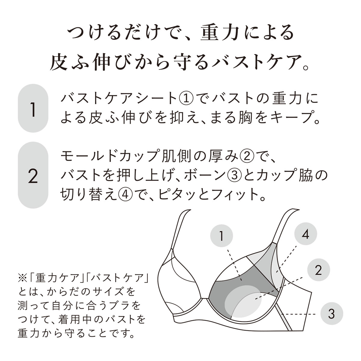 つけるだけで重力によるバストの皮膚伸びを抑え、気軽にバストケアができる【重力ケアブラ】。