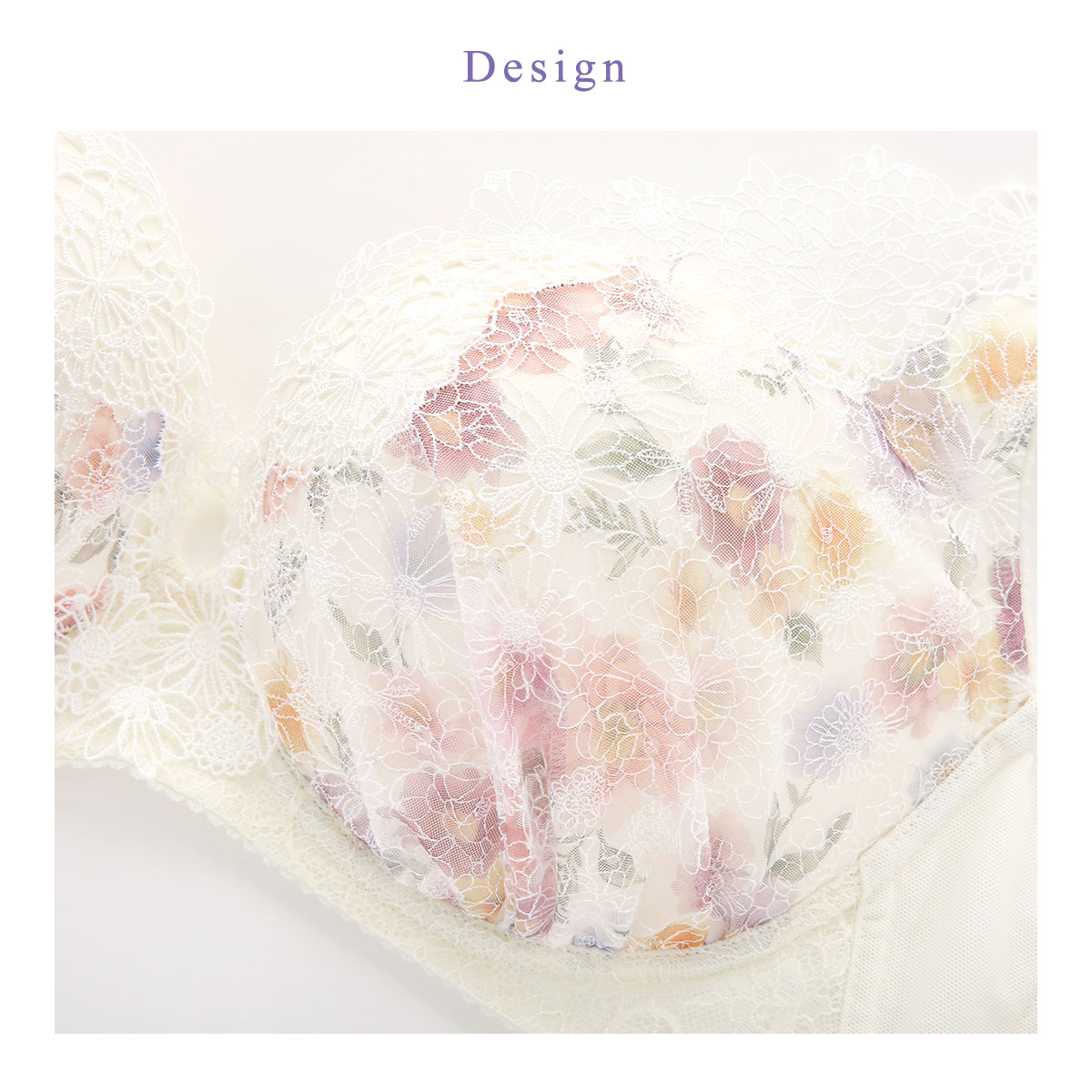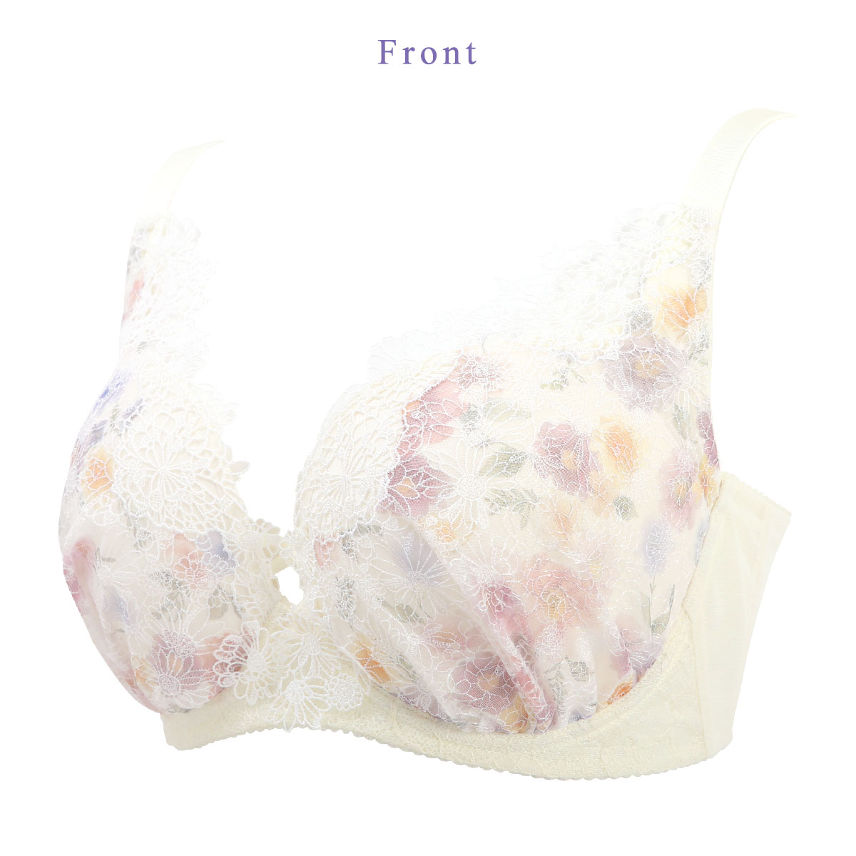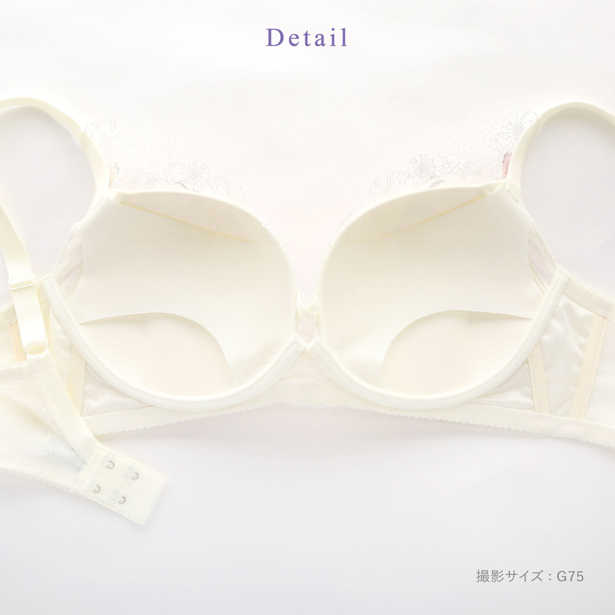モールドカップ肌側の厚みでバストを押し上げ、ボーンとカップ脇の切り替えで、ピタッとフィット。ハリとコシのあるプッシュアップ成型カップが自然なまるみのあるバストをメイク。前中心が低く、ノンワイヤーのため圧迫感の少ないラクなつけごこちです。