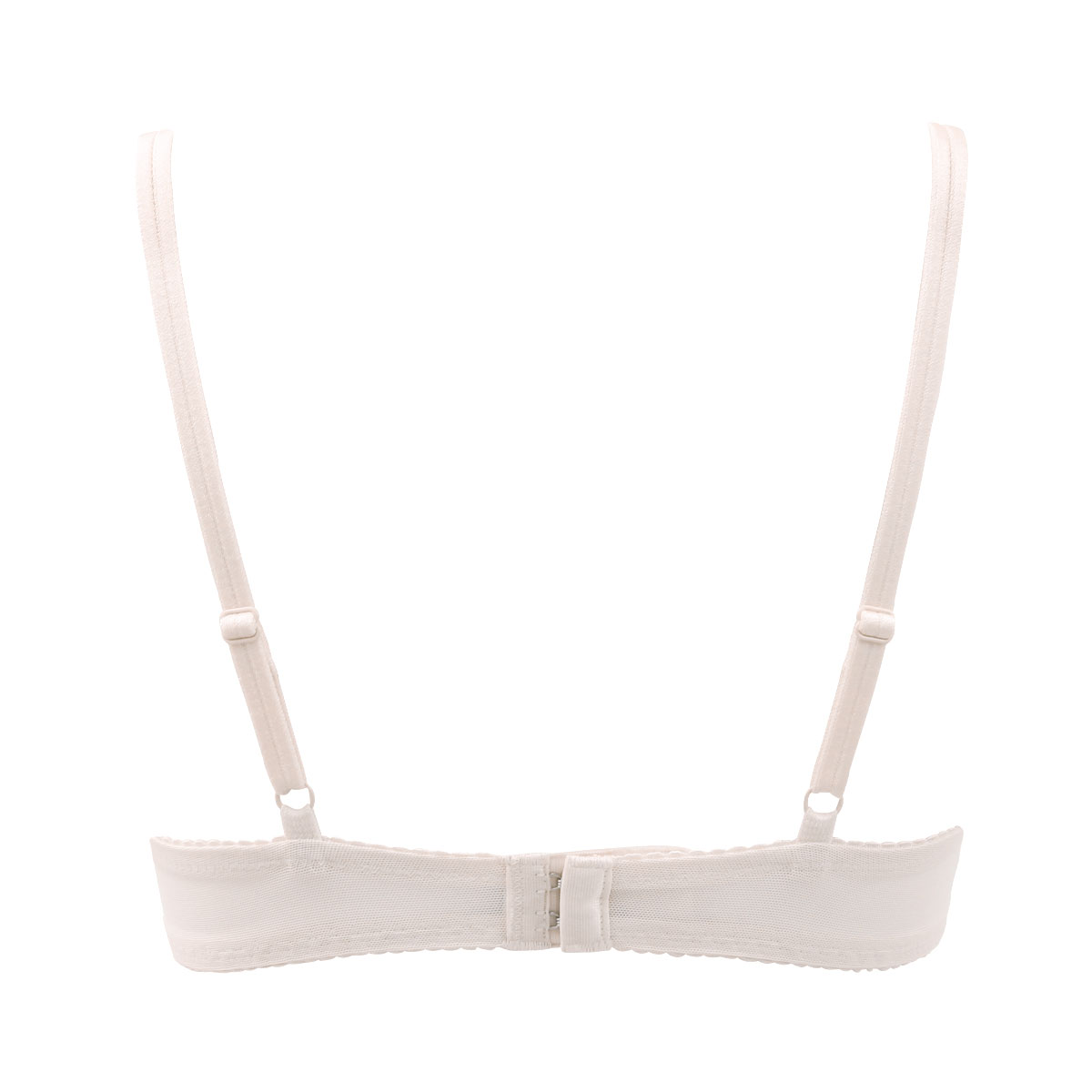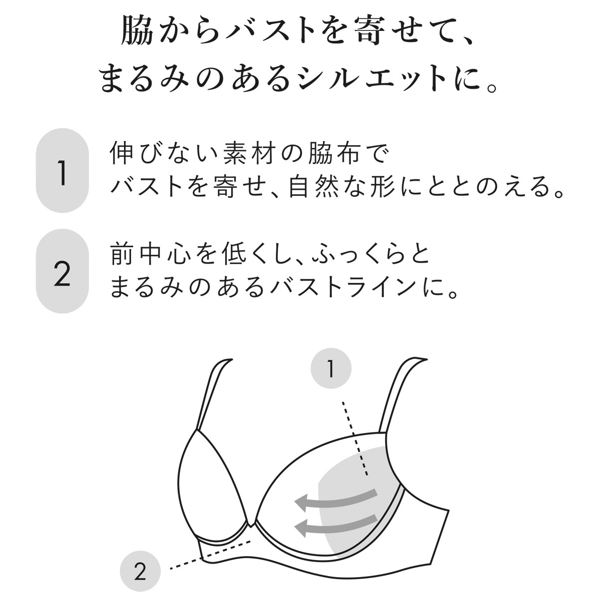 伸びない素材の脇布でバストを寄せて、ふっくらとした谷間をメイク。前中心の低いワイヤーでまるみのあるシルエットに。