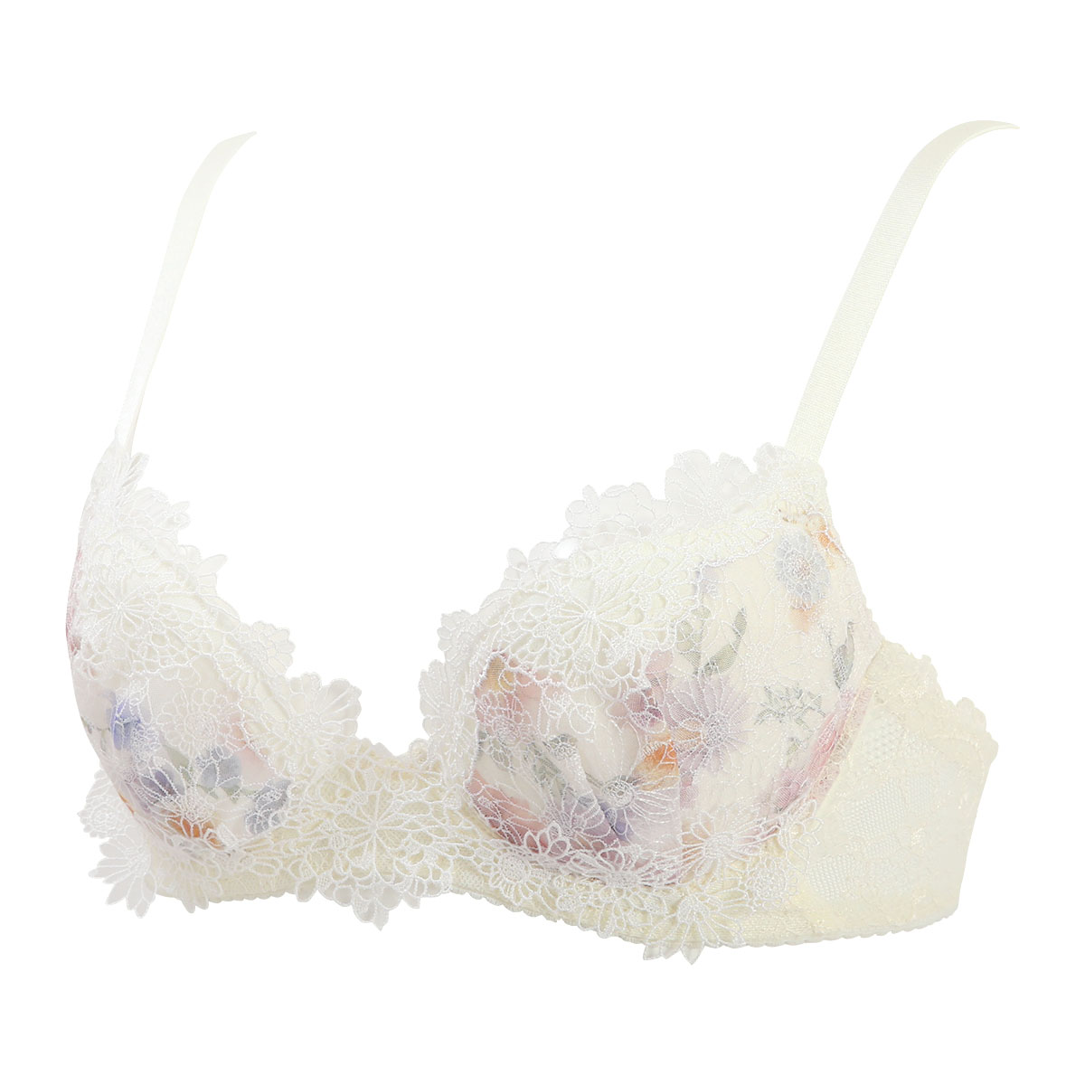 レトロポップな花柄のケミカルレースが贅沢なデザイン。繊細な細番手の糸を使ったインケミカルレースは透明感を演出。ケミカルアップリケとラッセルレースを組み合わせた土台は、モダンでかわいらしさもある仕上がりに。WH・YEカラーにはプリントをあしらい、華やかさを一層引き立てました。