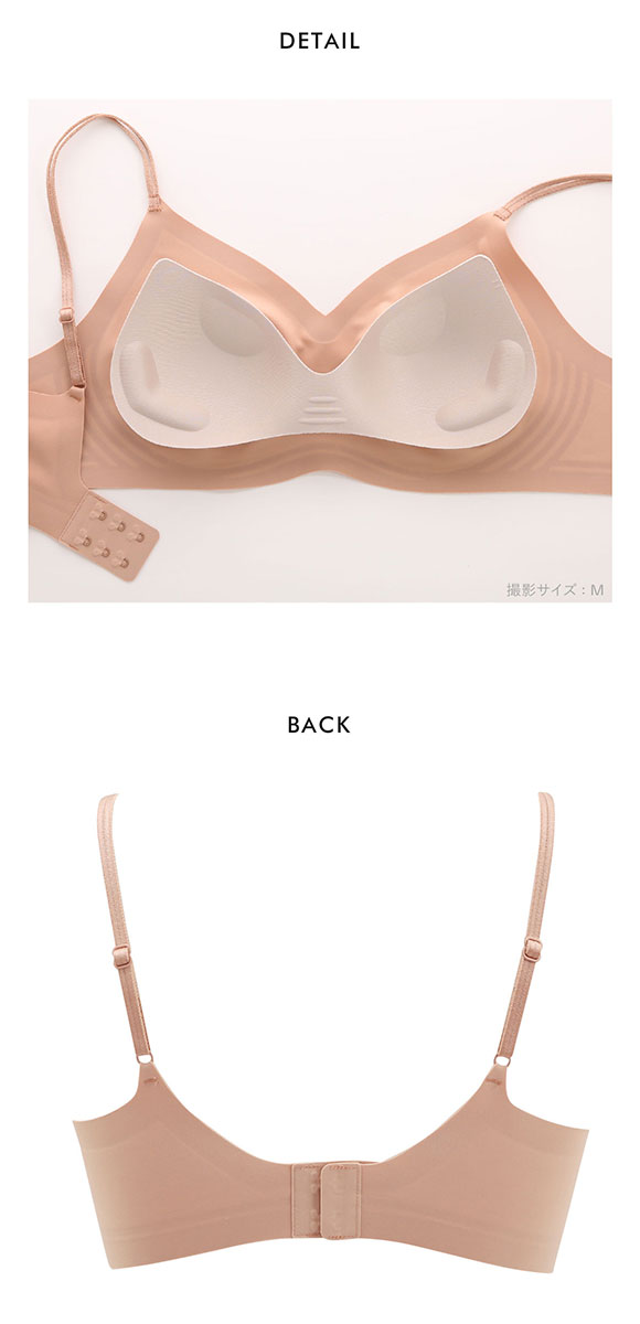 立体感と厚みのある左右一体型のピーナッツ型パッド(ねこ耳タイプ)入りで、上向きで立体的なバストシルエットでありながら、バストトップ間隔が離れず位置が安定。パッドの上辺が上胸に沿いやすいラインになっているので、横胸のシルエットをきれいにしてくれます。