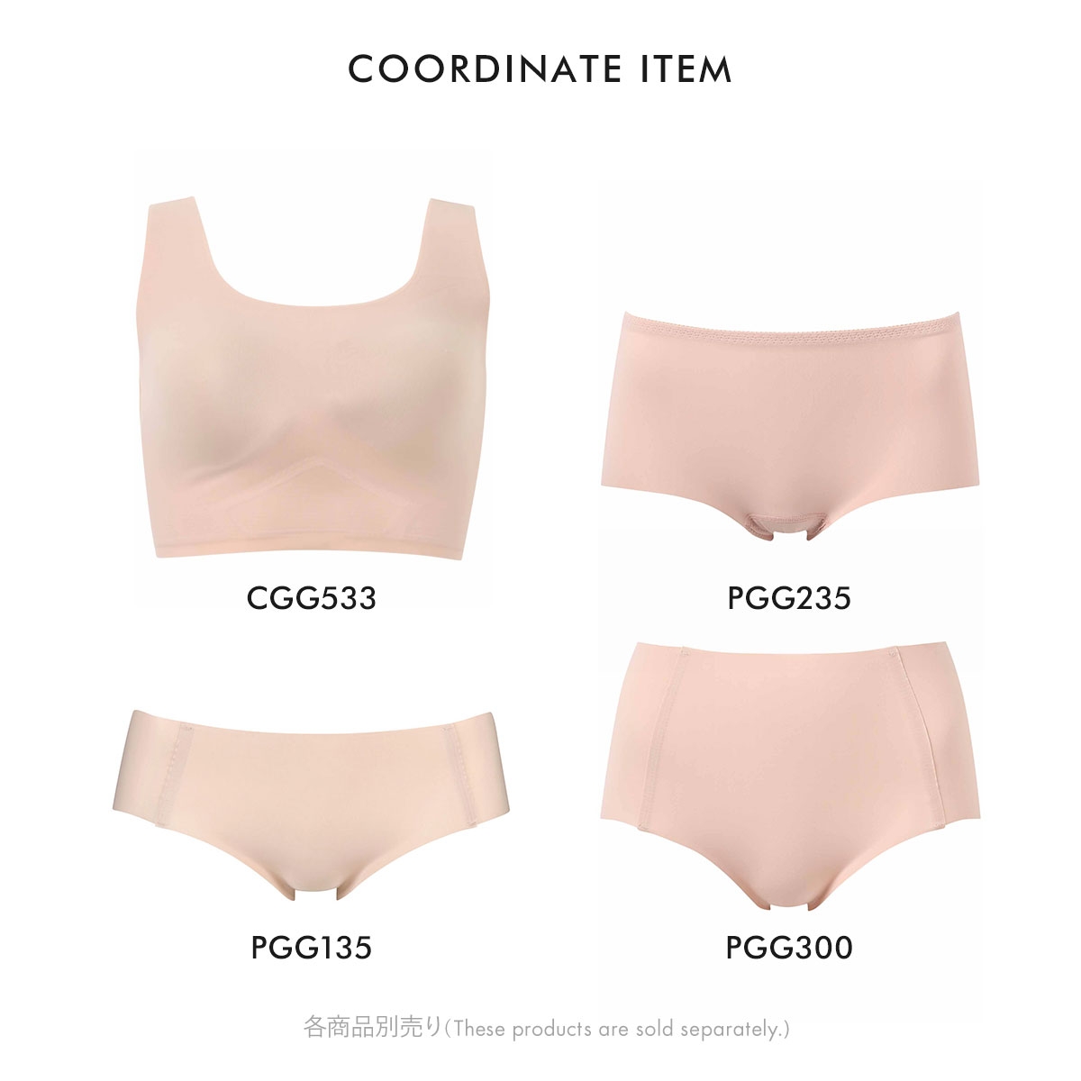 お肌に優しいフラット仕上げでお肌に縫い目があたらない、まるでつけていないようにここちよいかぶりタイプのハーフトップ。脇から背中にかけて接着部分を広範囲にすることで着くずれにくく安定感のある構造に。