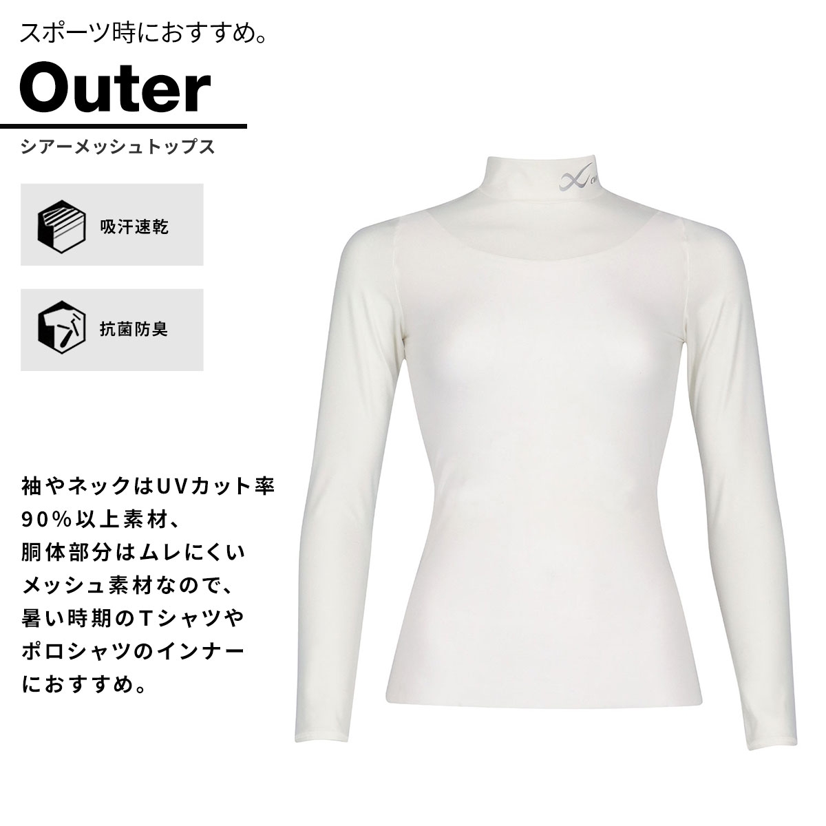 袖やネックはUVカット率90%以上素材、胴体部分はムレにくいメッシュ素材なので、暑い時期のTシャツやポロシャツのインナーにおすすめ。
