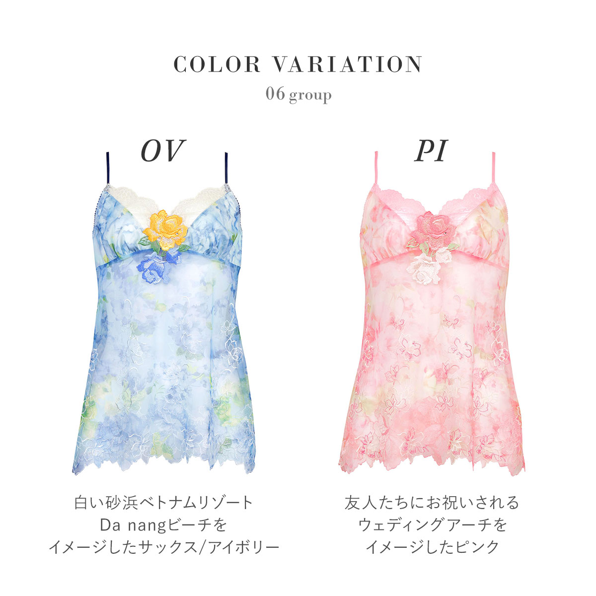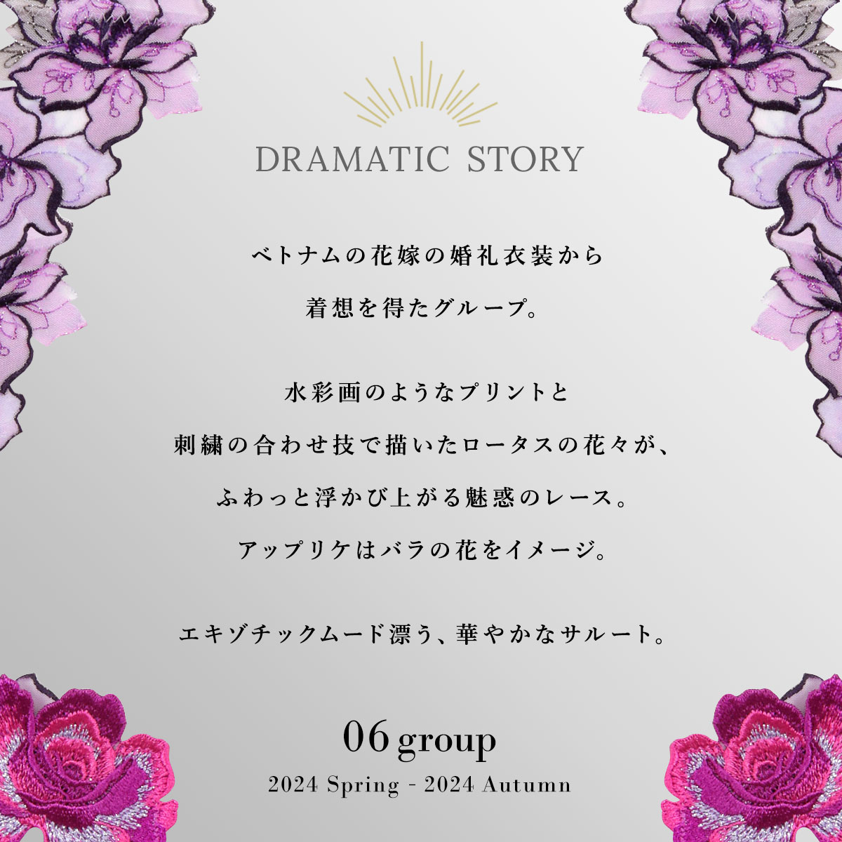 水彩画のようなプリントと刺繍の合わせ技で描いたロータスの花々が、ふわっと浮かび上がる魅惑のレース。胸もとにはラメ糸とスワロフスキークリスタルをあしらった、バラのアップリケを咲かせて。