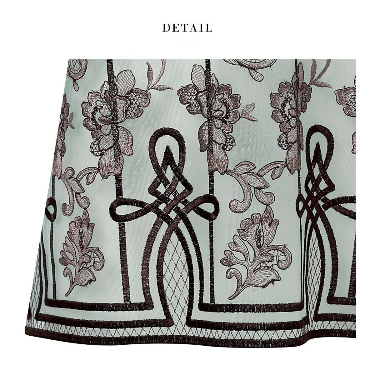 古代ギリシアの建築をイメージした格子柄のレースが印象的。胸もとの中心にはアカンサス文様をあしらったバラのアップリケを大胆に飾り、花びらにはスワロフスキー・クリスタルでキラキラと輝きを添えました。