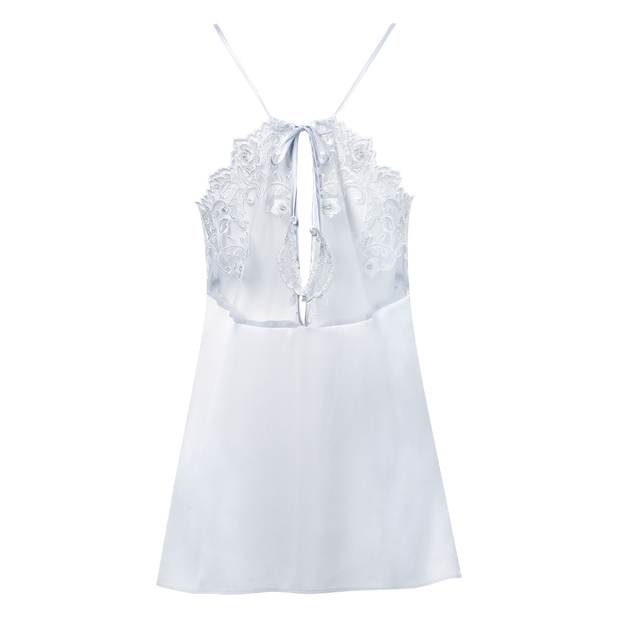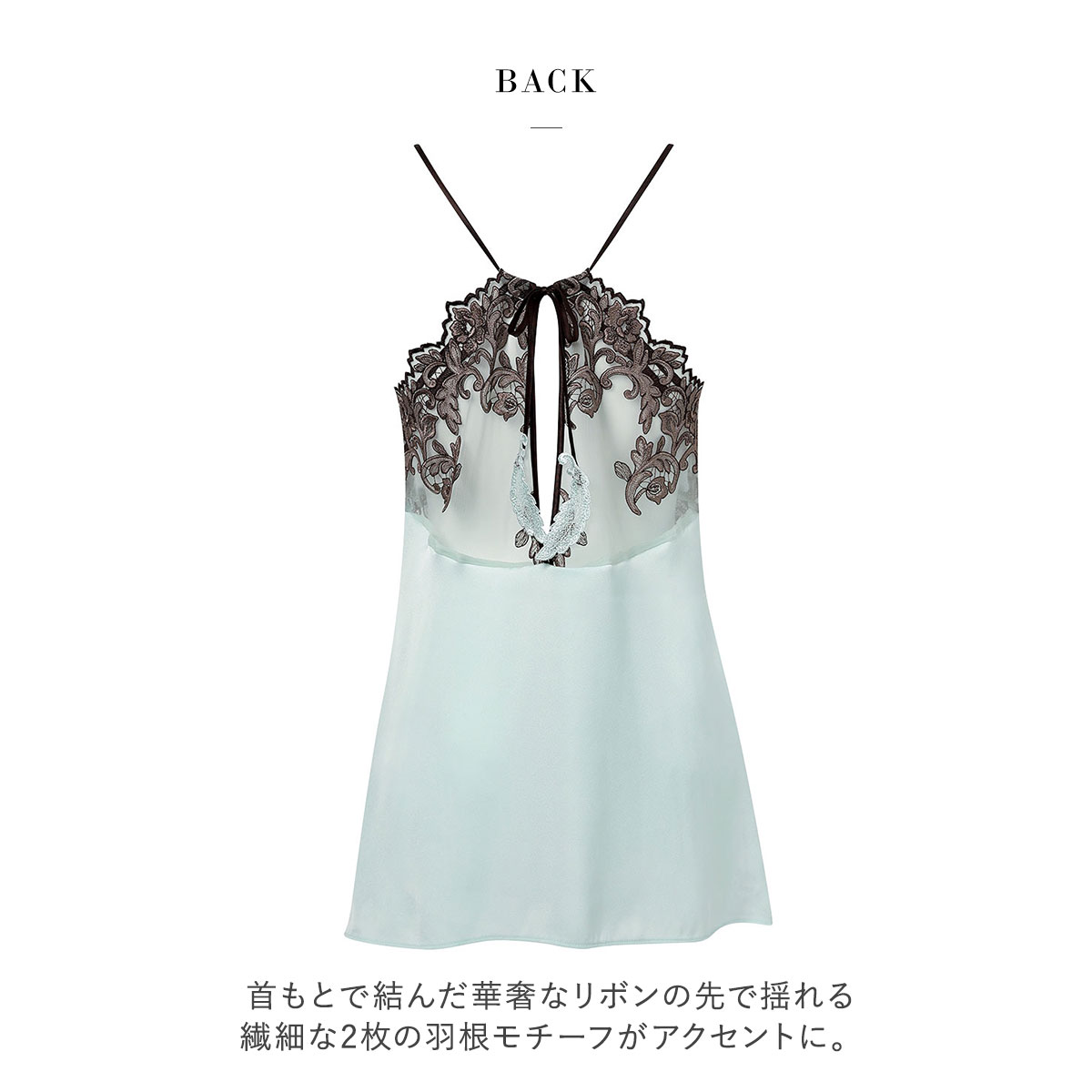 首もとで結んだ華奢なリボンの先で揺れる繊細な2枚の羽根モチーフがアクセントに。背中のレースの開き具合は、リボンで調整ができます。