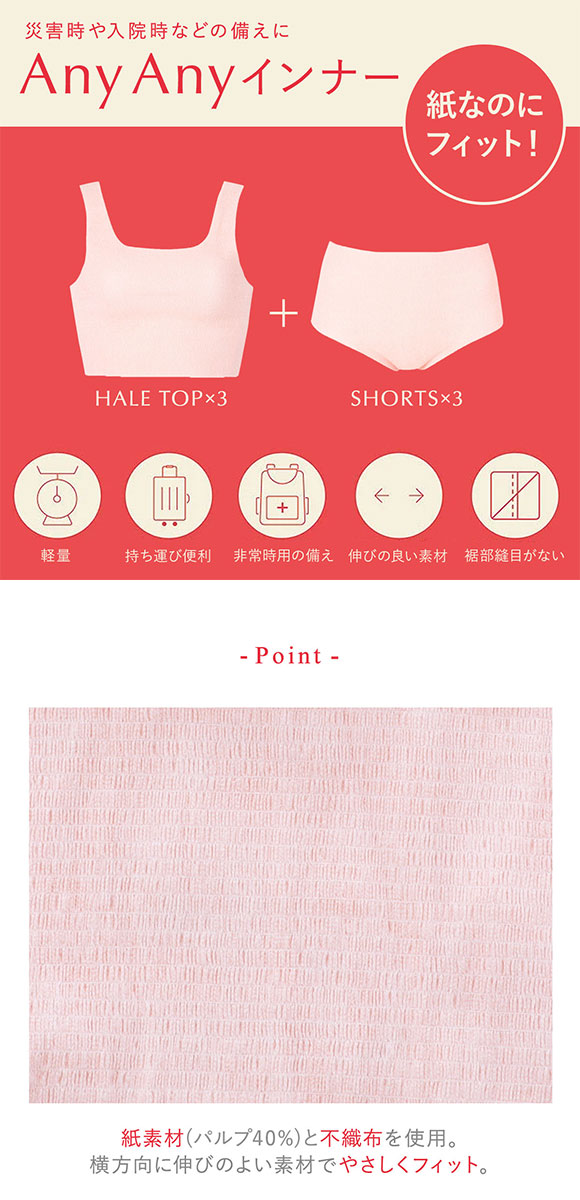 災害など非常時の備えや、旅行にも携帯しておける1回使いきりの「ハーフトップ3枚とショーツ3枚セット」。