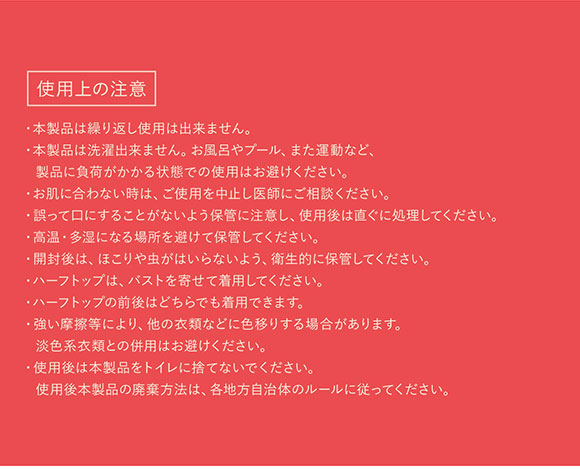 【ハーフトップ】 ・ホックなし、かぶりタイプ ・パッドなし、パッドポケットなし ・肩紐取外し:不可 ・肩紐調節:不可 ・ノンワイヤー ・サイドボーン:なし ※ハーフトップは、バストを寄せて着用してください。 ※ハーフトップの前後はどちらでも着用できます。