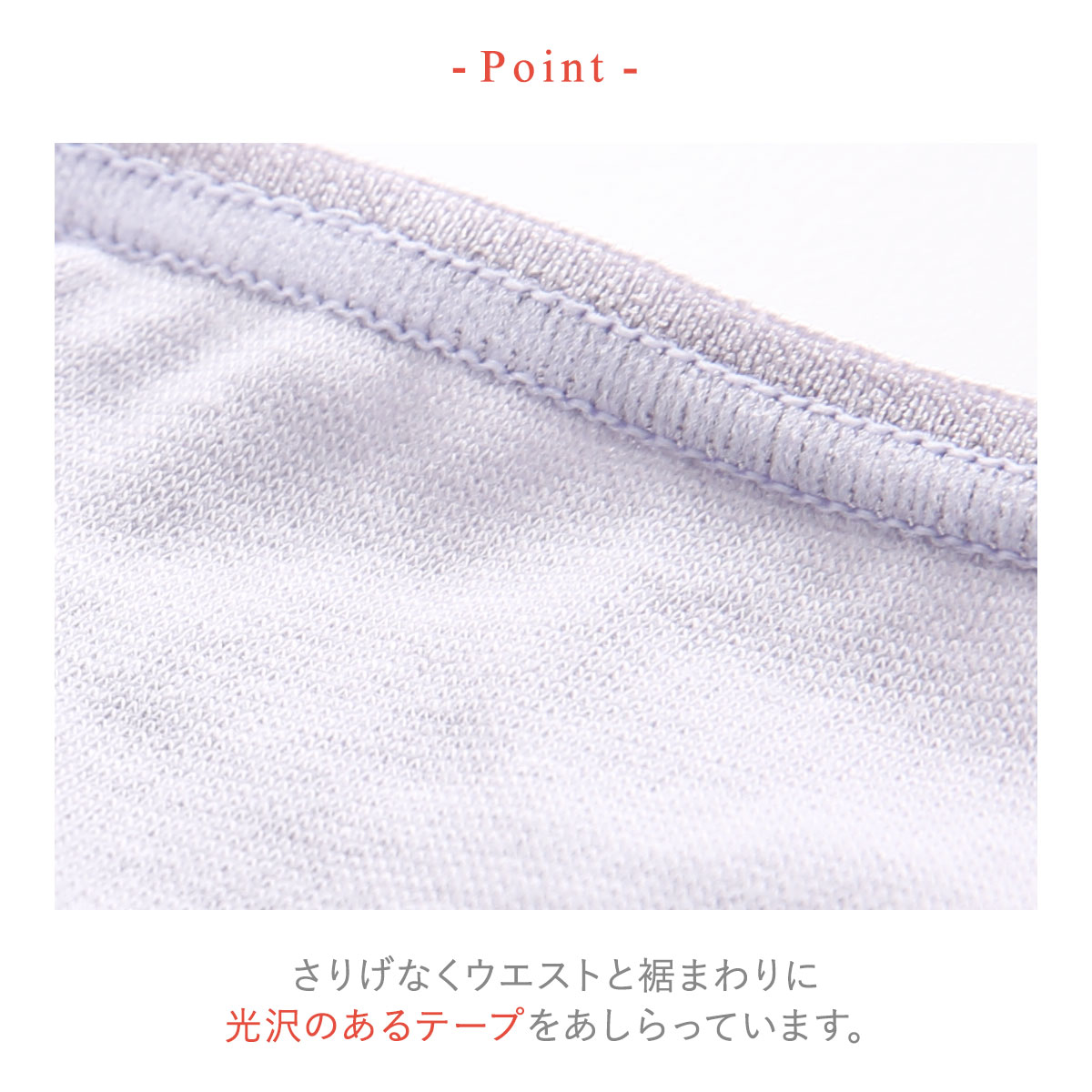 シンプルなデザインに、さりげなくウエストに光沢のあるテープをあしらった、伸びやかでやさしい肌ざわりを毎日の定番に。
