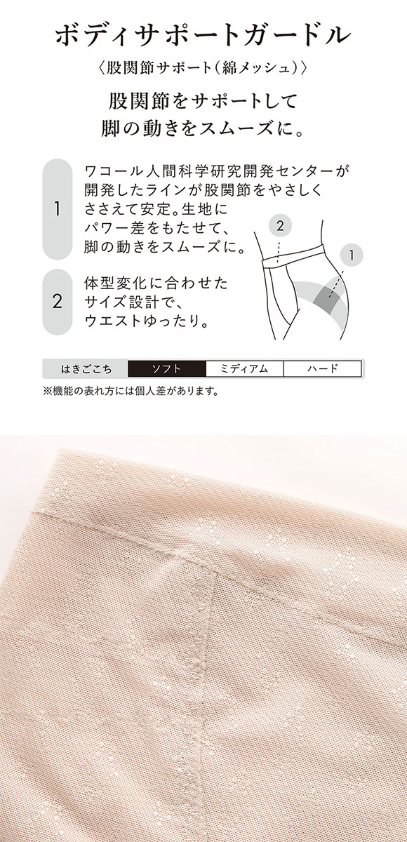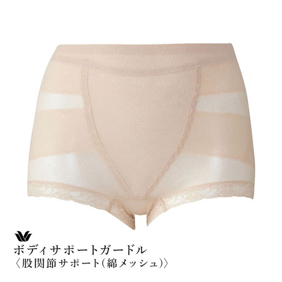 ワコール人間科学研究開発センターが設計した独自ラインが股関節まわりをやさしく支えて安定感をプラス。ラインにあて布をつけることで生地のパワー差を生み出し、脚の動きをスムーズにサポートする【ボディサポートガードル<股関節サポート(綿メッシュ)>】