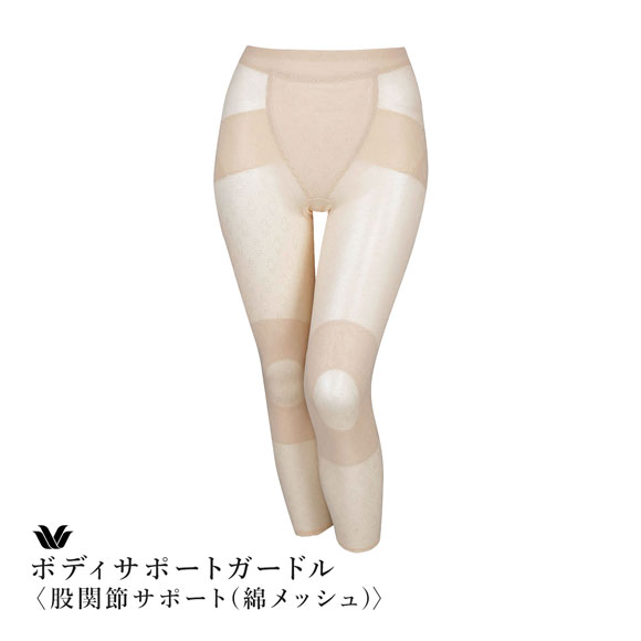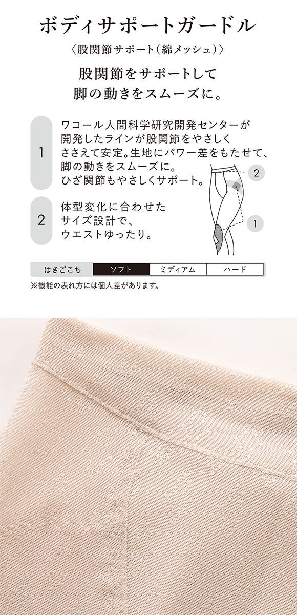 ワコール人間科学研究開発センターが設計した独自ラインが股関節まわりをやさしく支えて安定感をプラス。ラインにあて布をつけることで生地のパワー差を生み出し、脚の動きをスムーズにサポートする【ボディサポートガードル<股関節サポート(綿メッシュ)>】