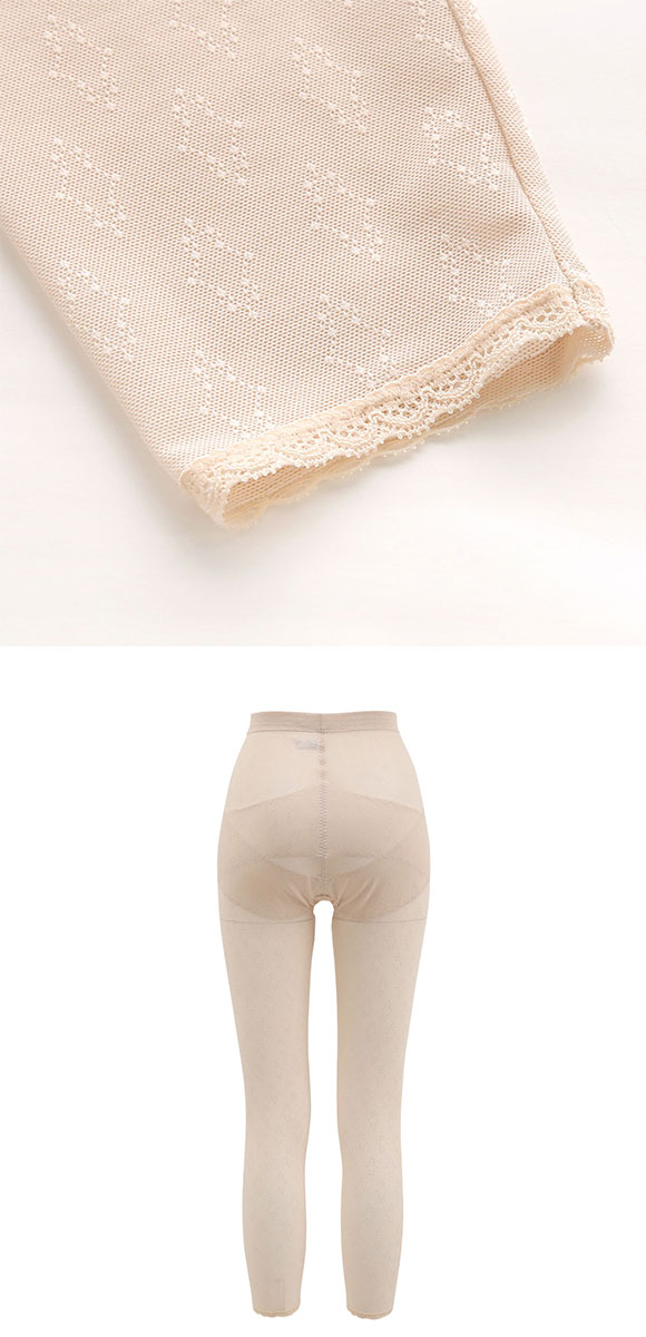 お腹まわりはフロントのあて布でほどよくサポートし、すっきりとしたシルエットへ。ウエスト部分は折り返し仕様で段差を軽減し、くい込みにくい快適設計です。