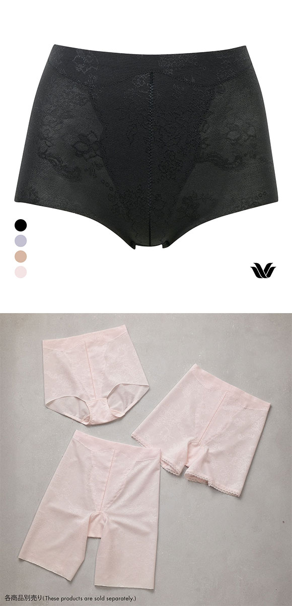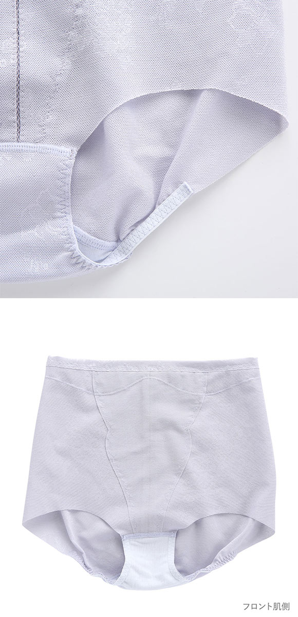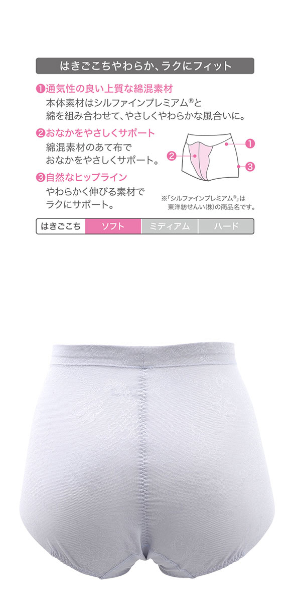 本体は薄く肌ざわりのよいシルファインプレミアムと綿を組み合わせた綿混メッシュ生地でやわらかく伸び、気持ちよくヒップをサポート。