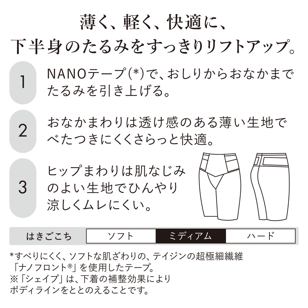 すべりにくく、ソフトな肌ざわりの超極細繊維を使用した素材【NANOテープ】が、着用時に引き上げたたるみをキープする「すべり止め」効果を発揮。太ももからヒップ、下腹まですっきりと逆立ちしたときのような縦長スリムシルエットをメイクします。