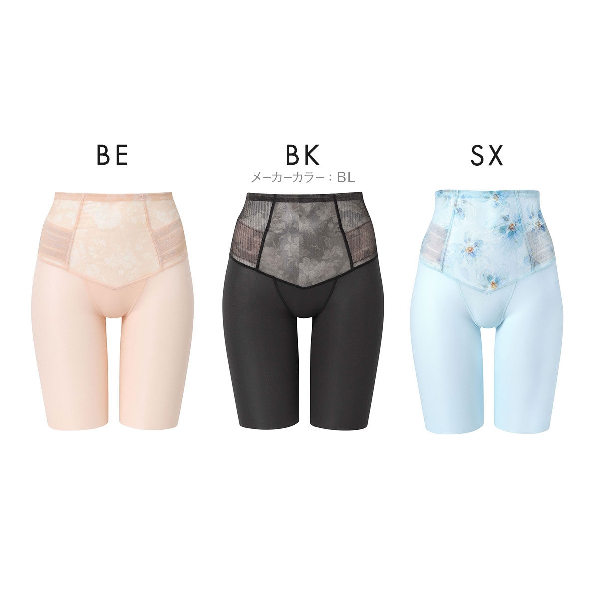 はきこみ丈を通常のジャストウエストより高めの丈にすることで、ふとももからおなか、ふとももからヒップのリフトアップ効果を高め、よりスリムなシルエットを追求。さらにヒップ下はパワー切り替えのない素材で、たるみをぴったり包み、美しいシルエットをキープ。